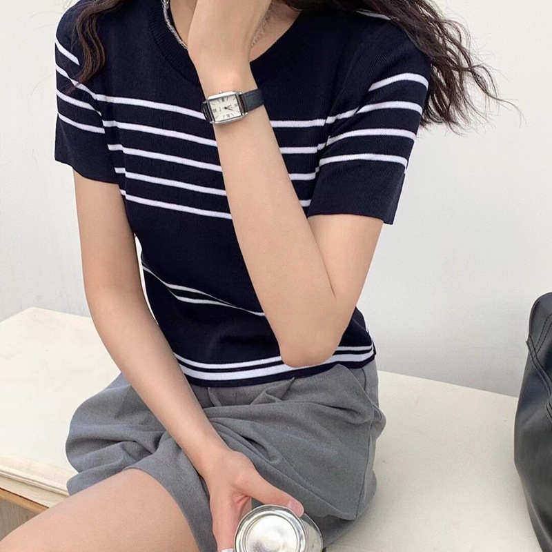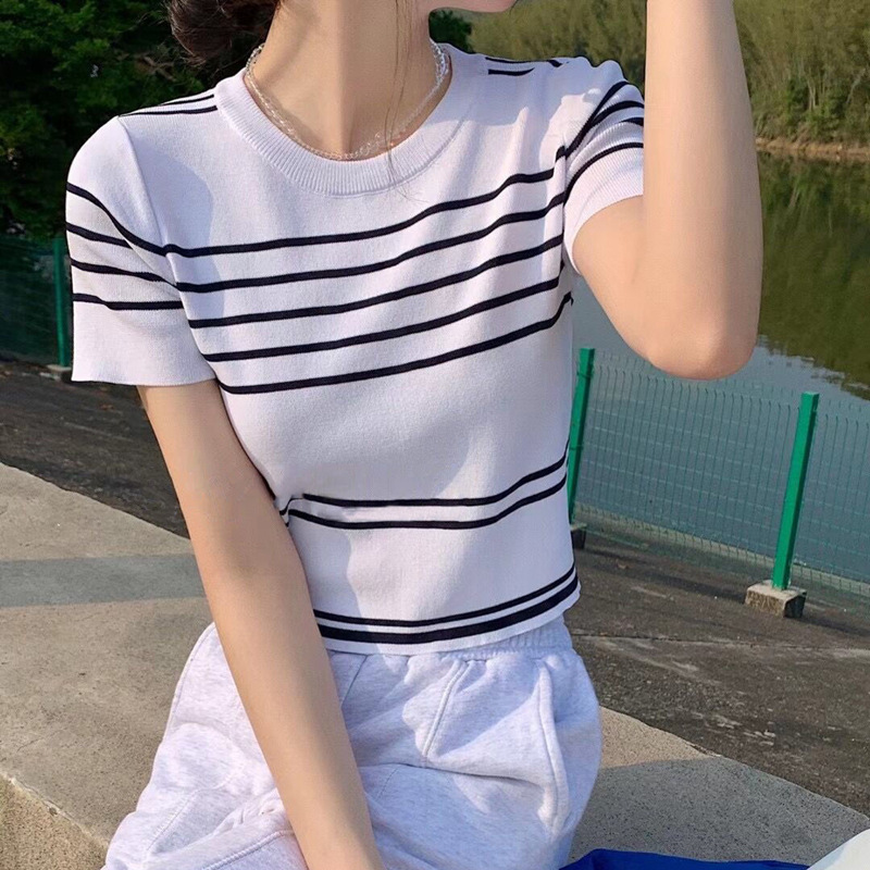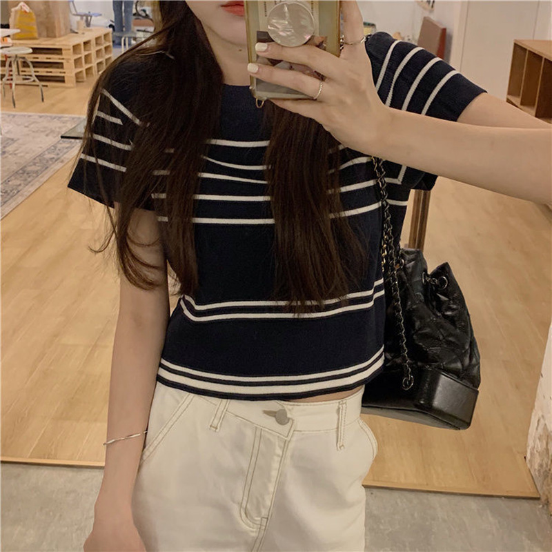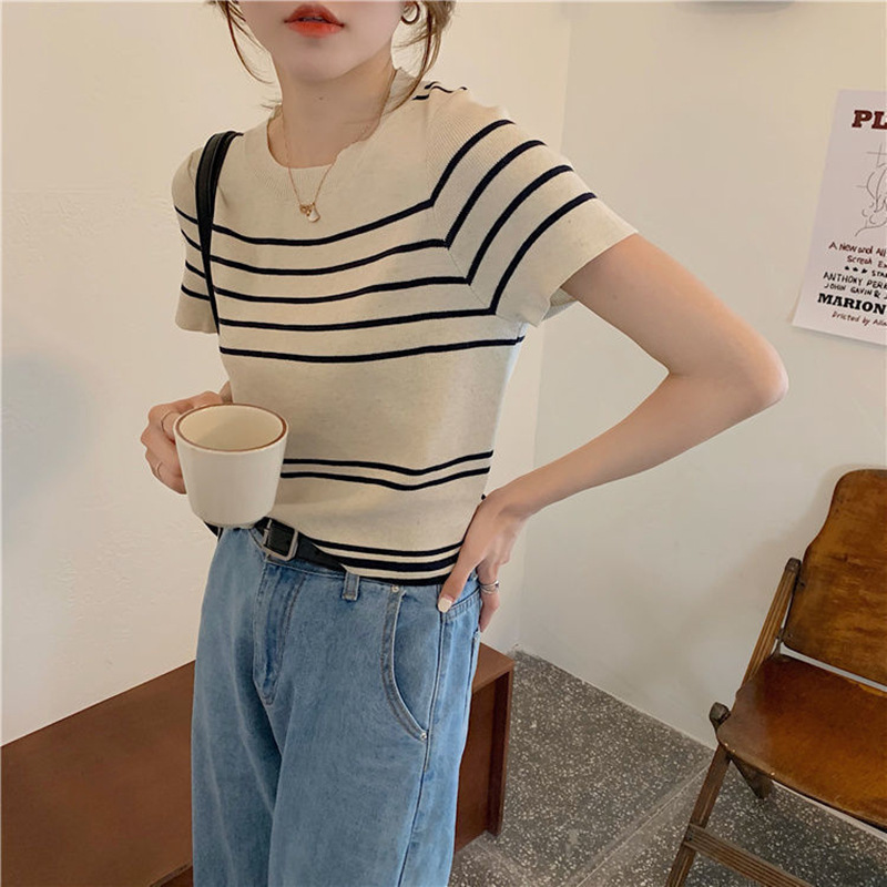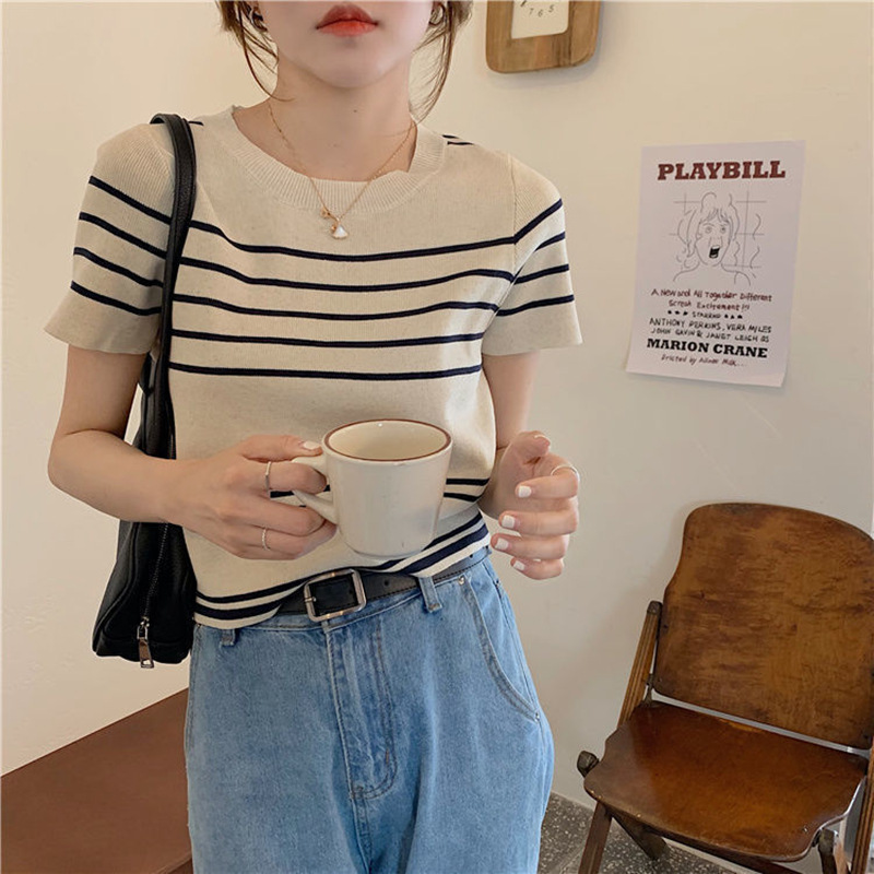 인즈 레트로 웨스턴 스타일 올 매치 반팔 라운드 넥 대조 컬러 스트라이프 짧은 아이스 실크 얇은 니트 티셔츠 탑