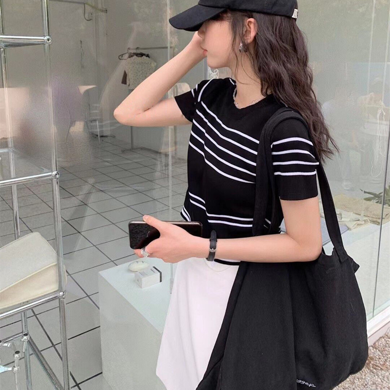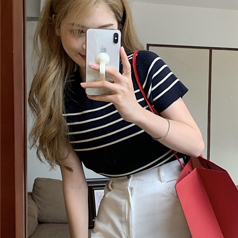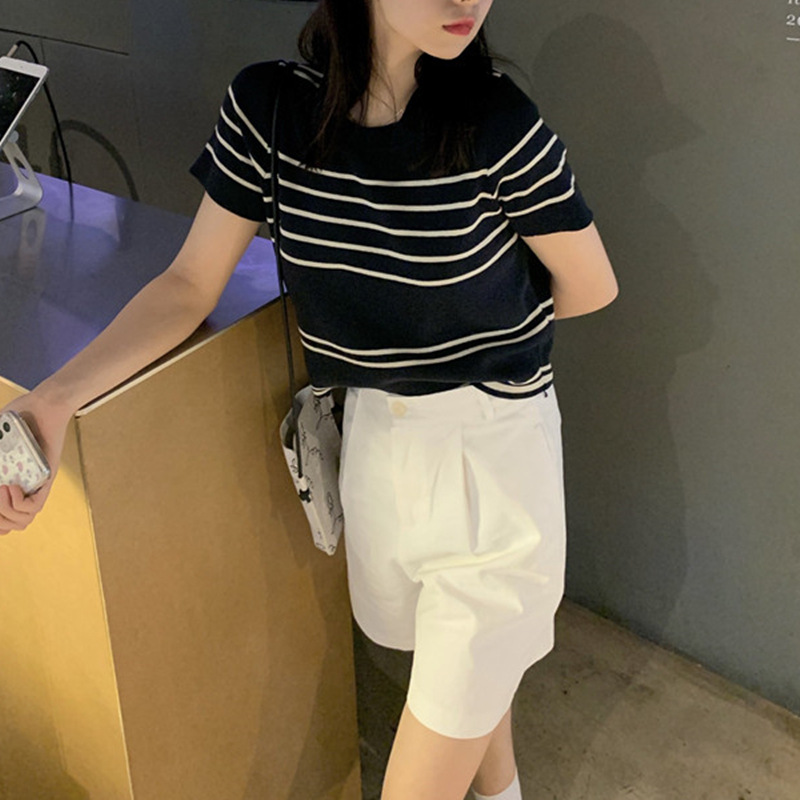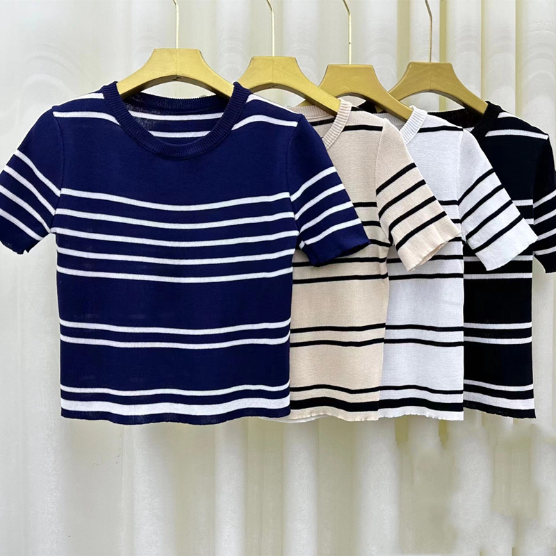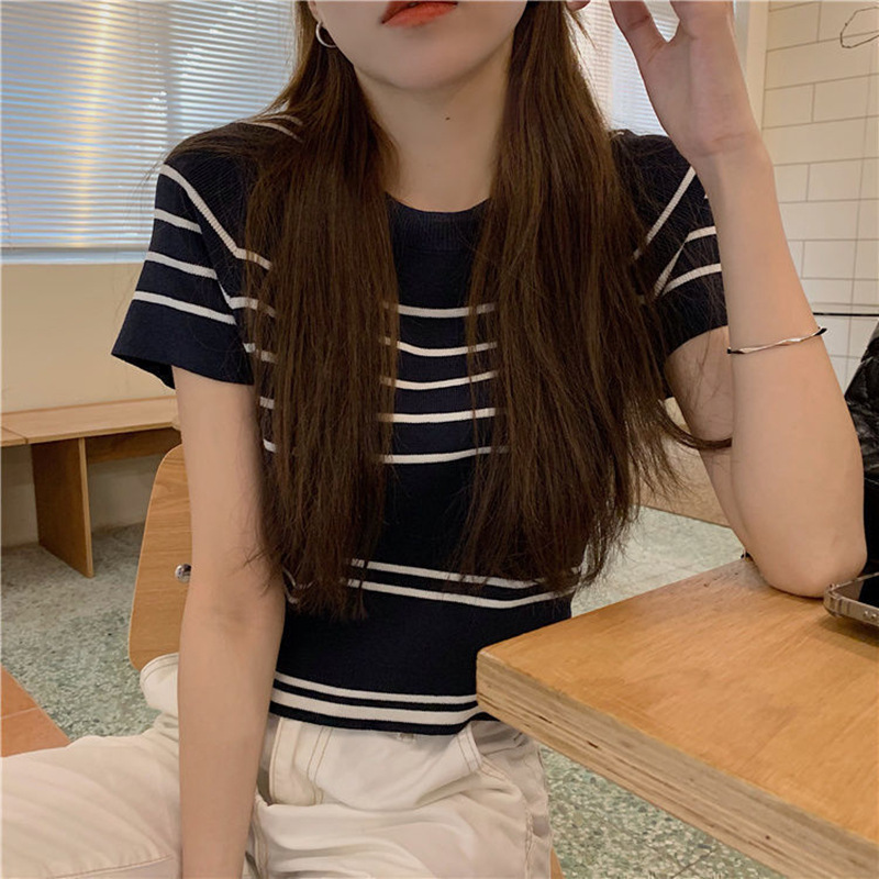 인즈 레트로 웨스턴 스타일 올 매치 반팔 라운드 넥 대조 컬러 스트라이프 짧은 아이스 실크 얇은 니트 티셔츠 탑