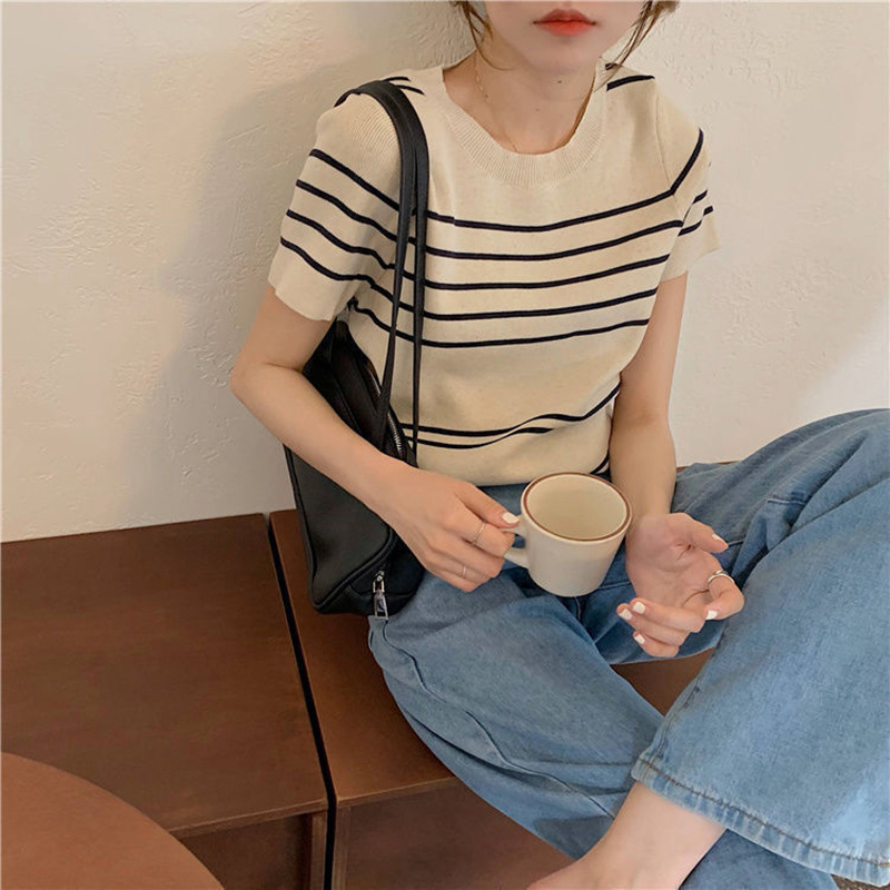인즈 레트로 웨스턴 스타일 올 매치 반팔 라운드 넥 대조 컬러 스트라이프 짧은 아이스 실크 얇은 니트 티셔츠 탑스토어 가기
