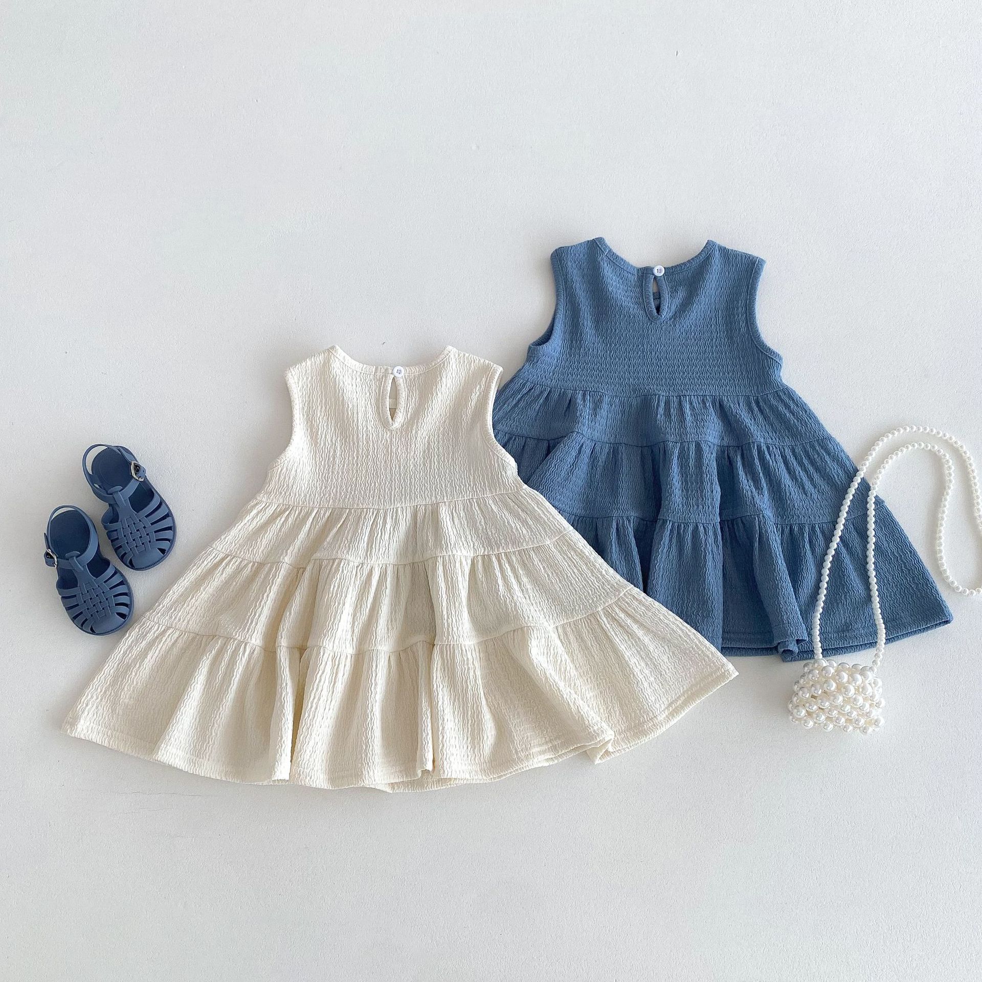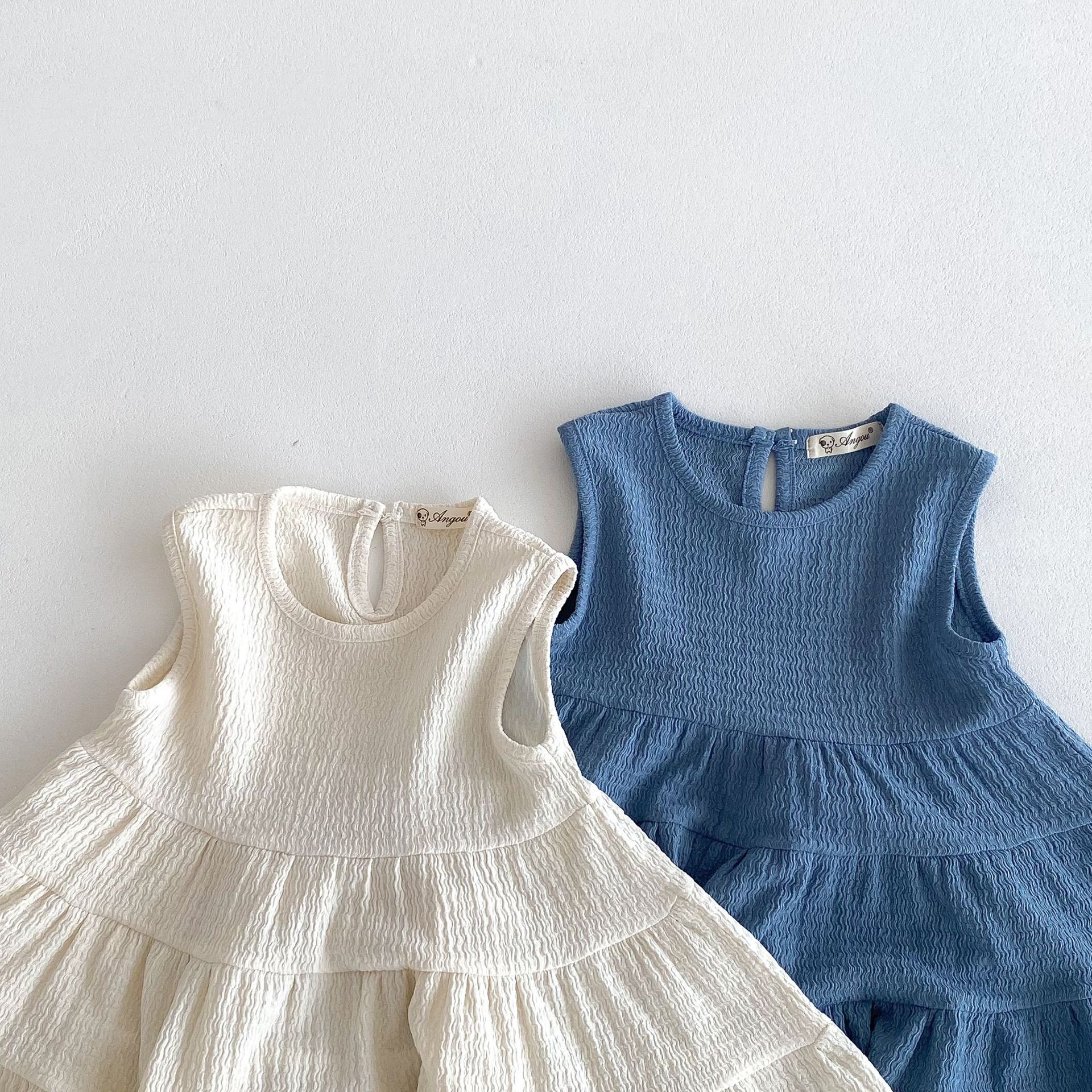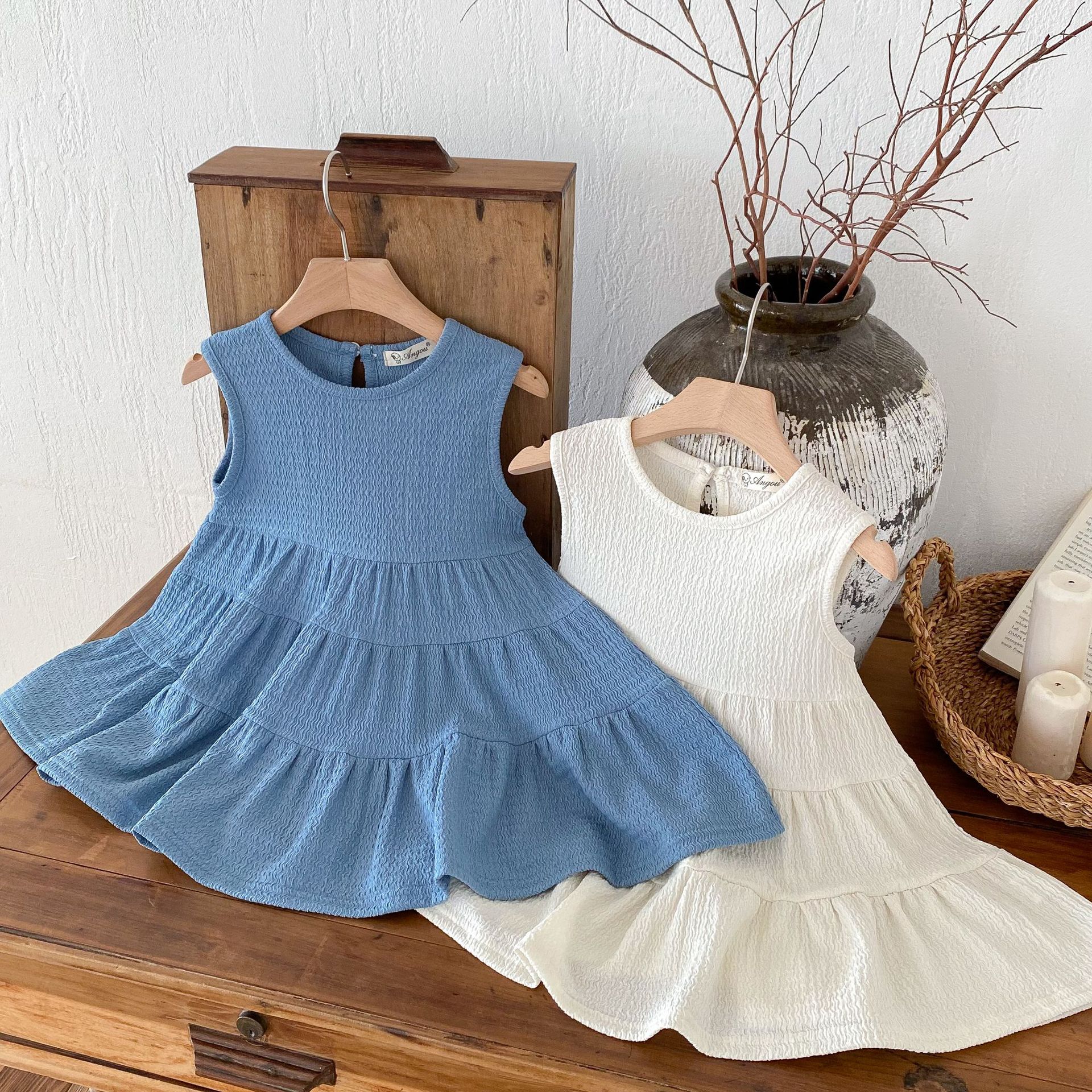 어린이 착용 한국식 여름 24 새로운 어린 시절 단색 주름 얇은 면 느슨한 소매 없는 빈 원피스 여자 원피스