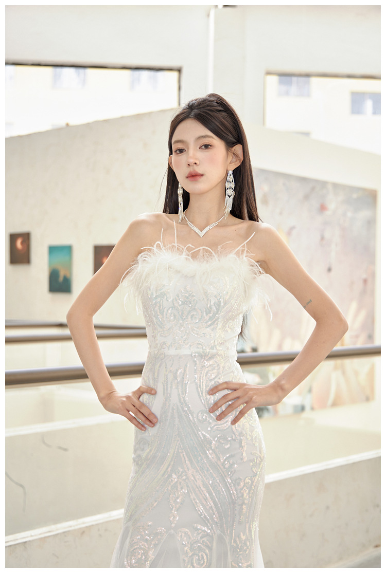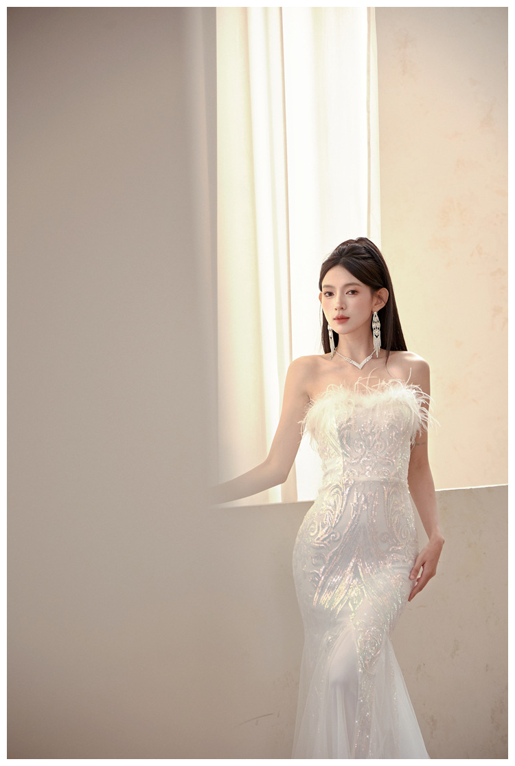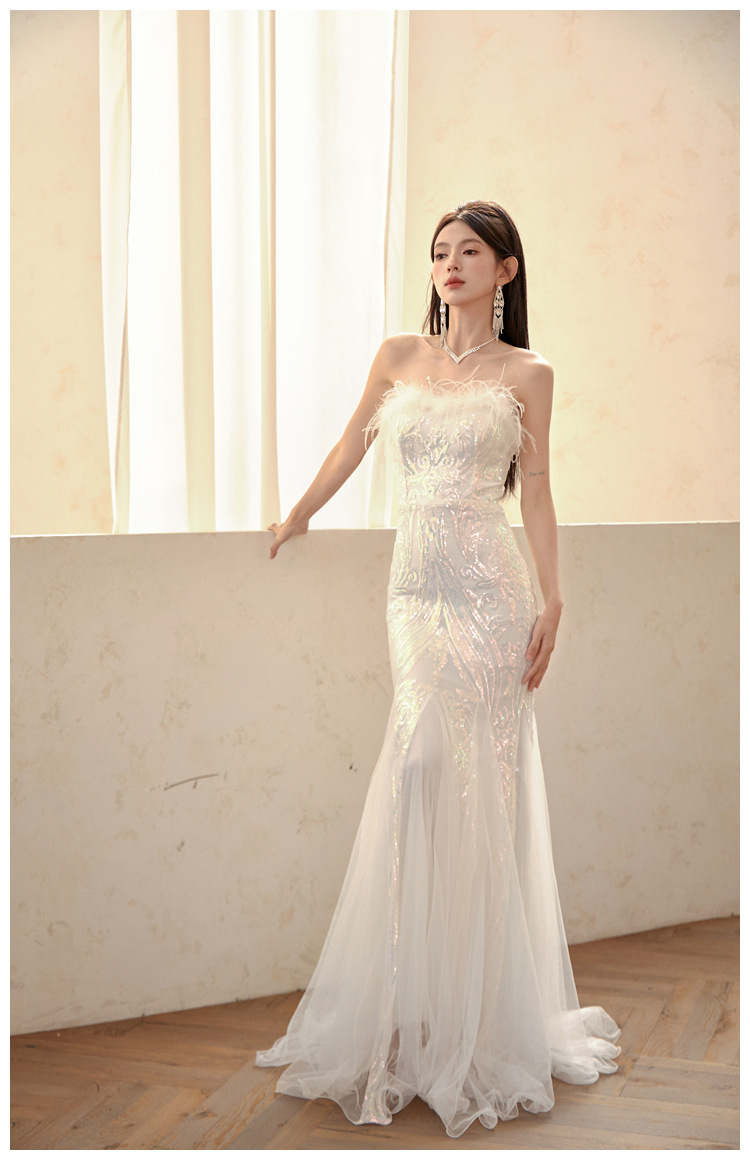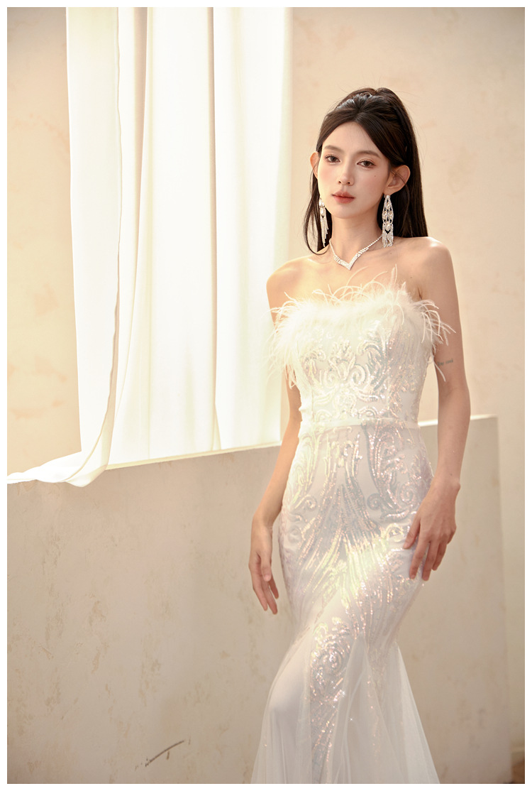 우아한 이브닝 드레스 2026 환상적인 인어공주풍 깃털 튜브탑 드레스 몸매를 돋보이게 하는 피쉬테일 드레스 파티 미니 드레스
