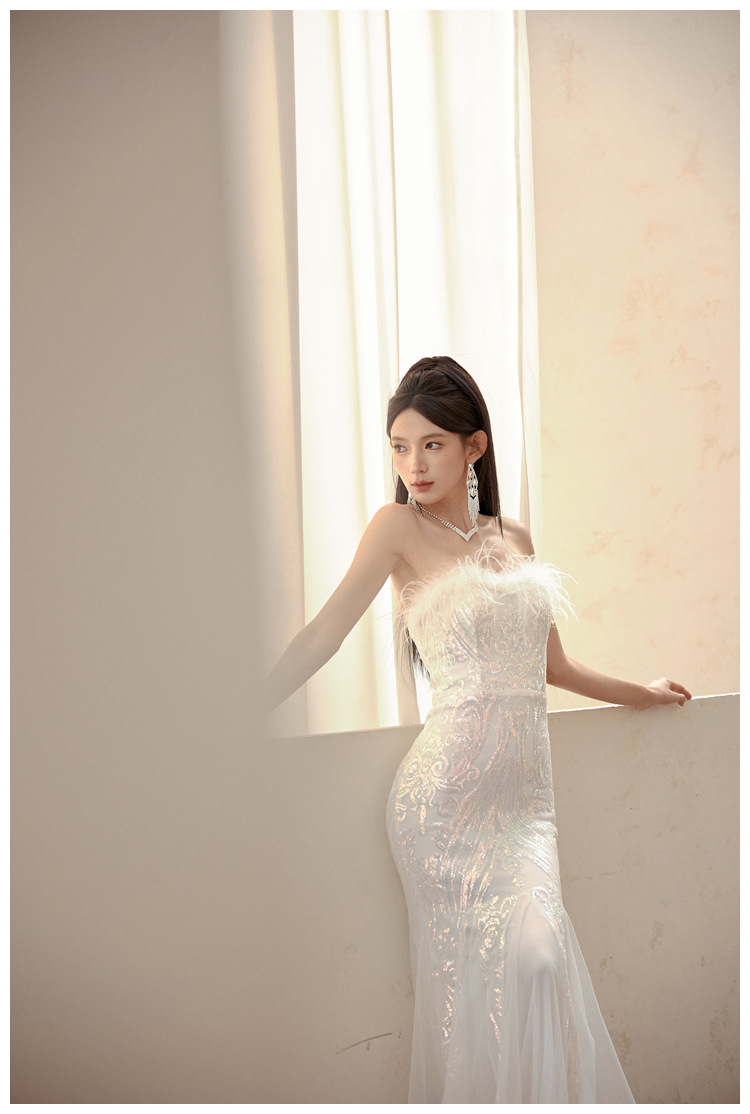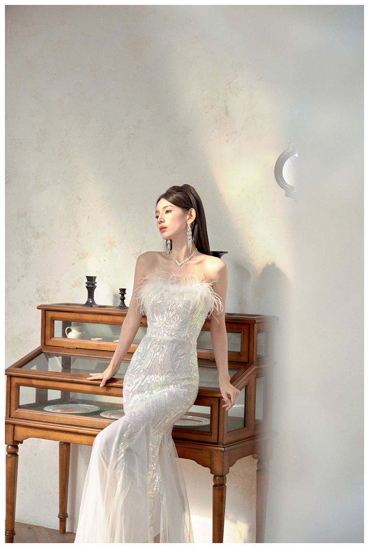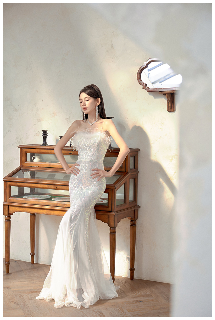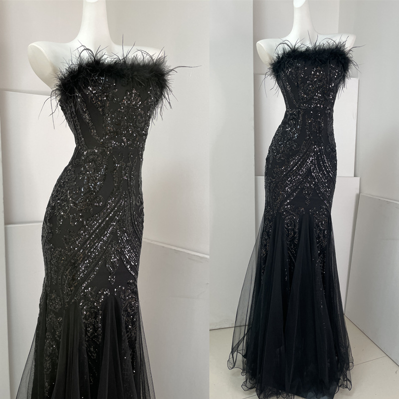 우아한 이브닝 드레스 2026 환상적인 인어공주풍 깃털 튜브탑 드레스 몸매를 돋보이게 하는 피쉬테일 드레스 파티 미니 드레스
