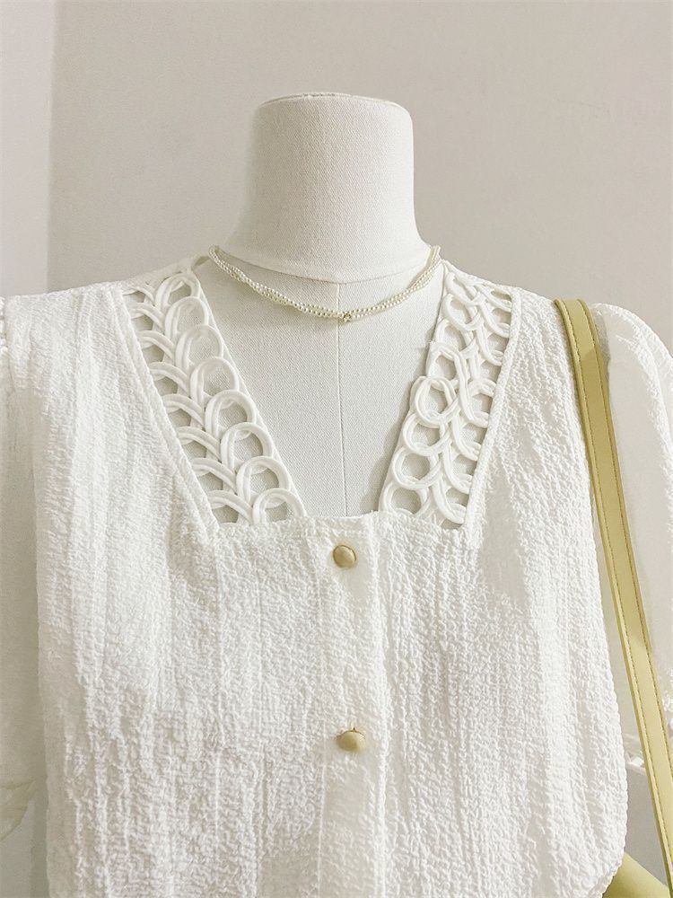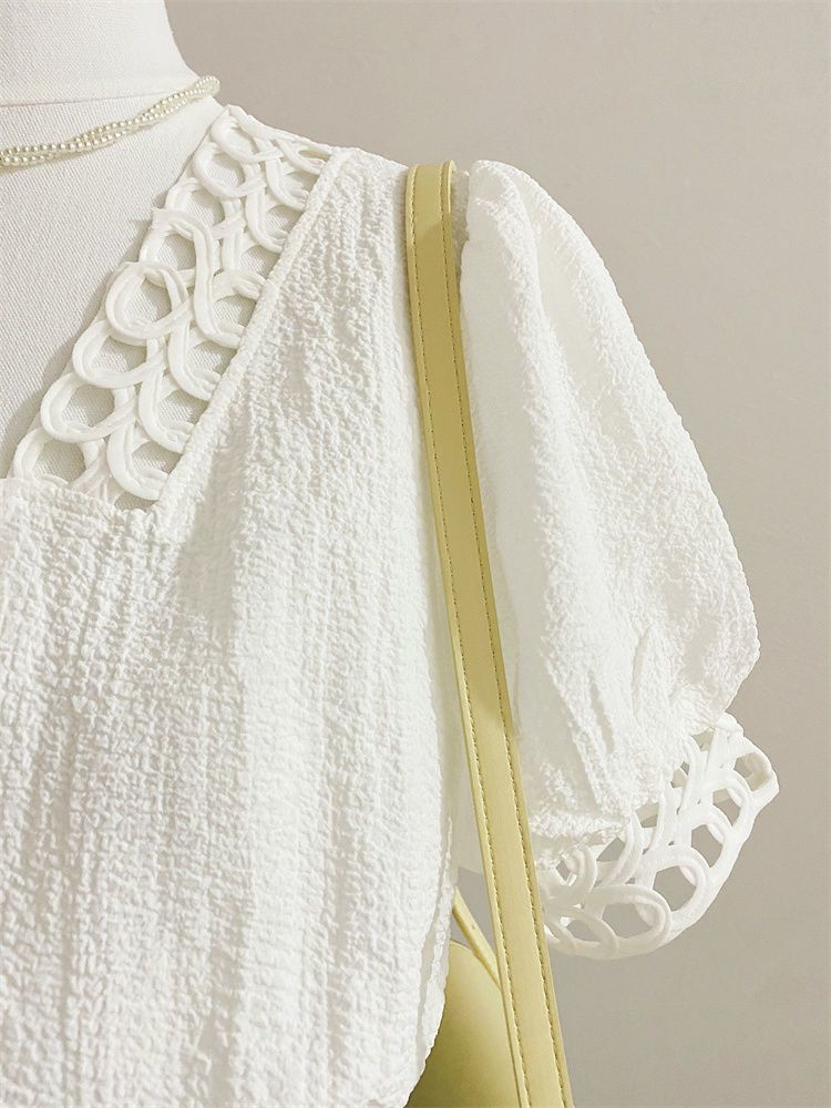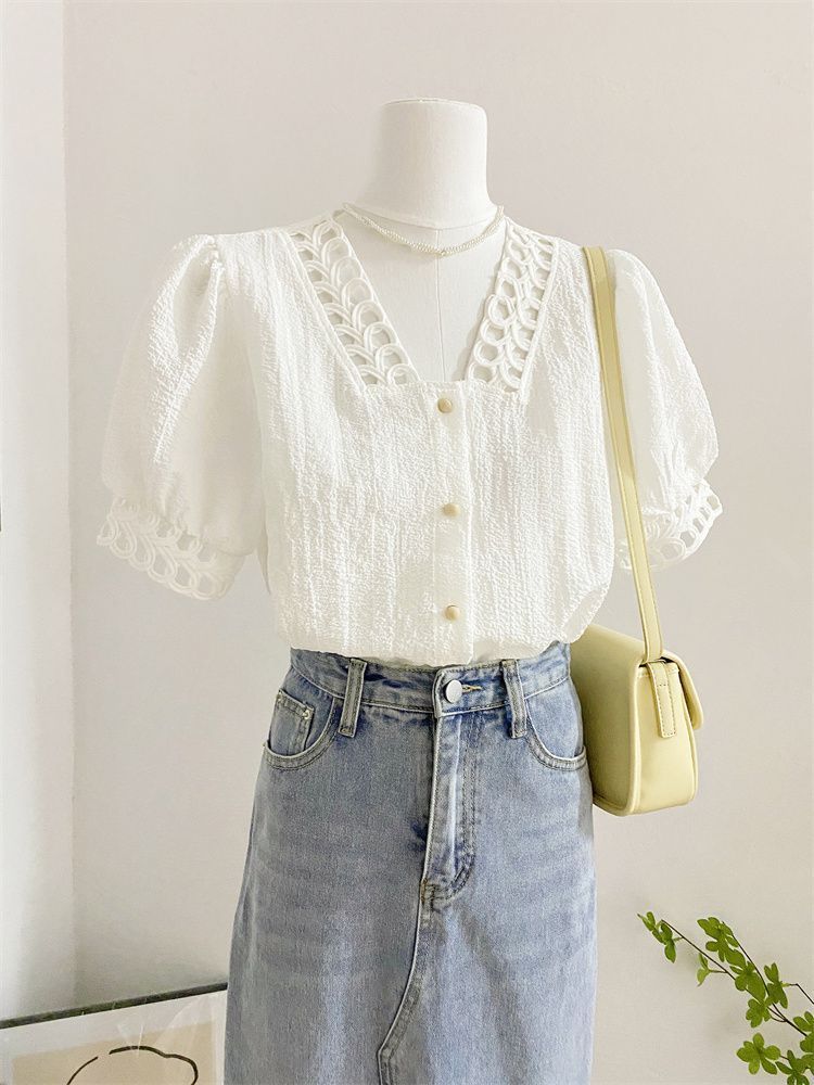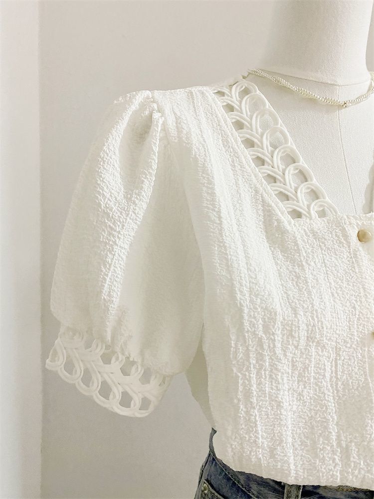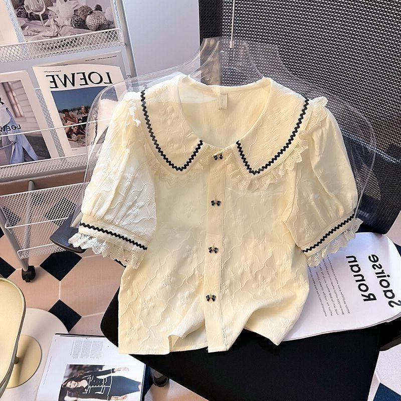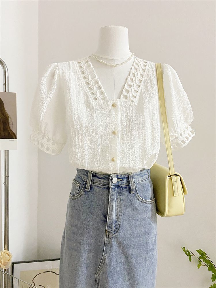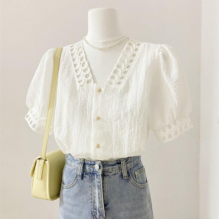틈새 레이스 달콤한 세련된 프렌치 퍼프 슬리브 탑 쉬폰 셔츠 여성의 짧은 소매 여름 새로운 디자인 감각스토어 가기