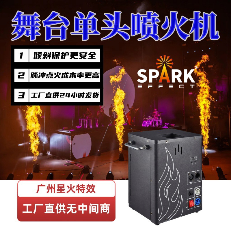 SPARK星火特效,SP-FL001高端单头喷火机采用新款脉冲点火器,点火成功率高达99%,比传统电子点火器的点火成功率更高,火焰更大更高,还配备了倾斜保护,当机器倾斜到一定程度时,会自动断电防止倾斜时依然工作导致的安全隐患,不锈钢喷油嘴,更耐用的同时,喷油均匀火焰也更加协调,耐高温陶瓷点火针,能抵御机器带来的高温,有点喷火球和长喷火柱模式随意切换,更加绽放火焰魅力