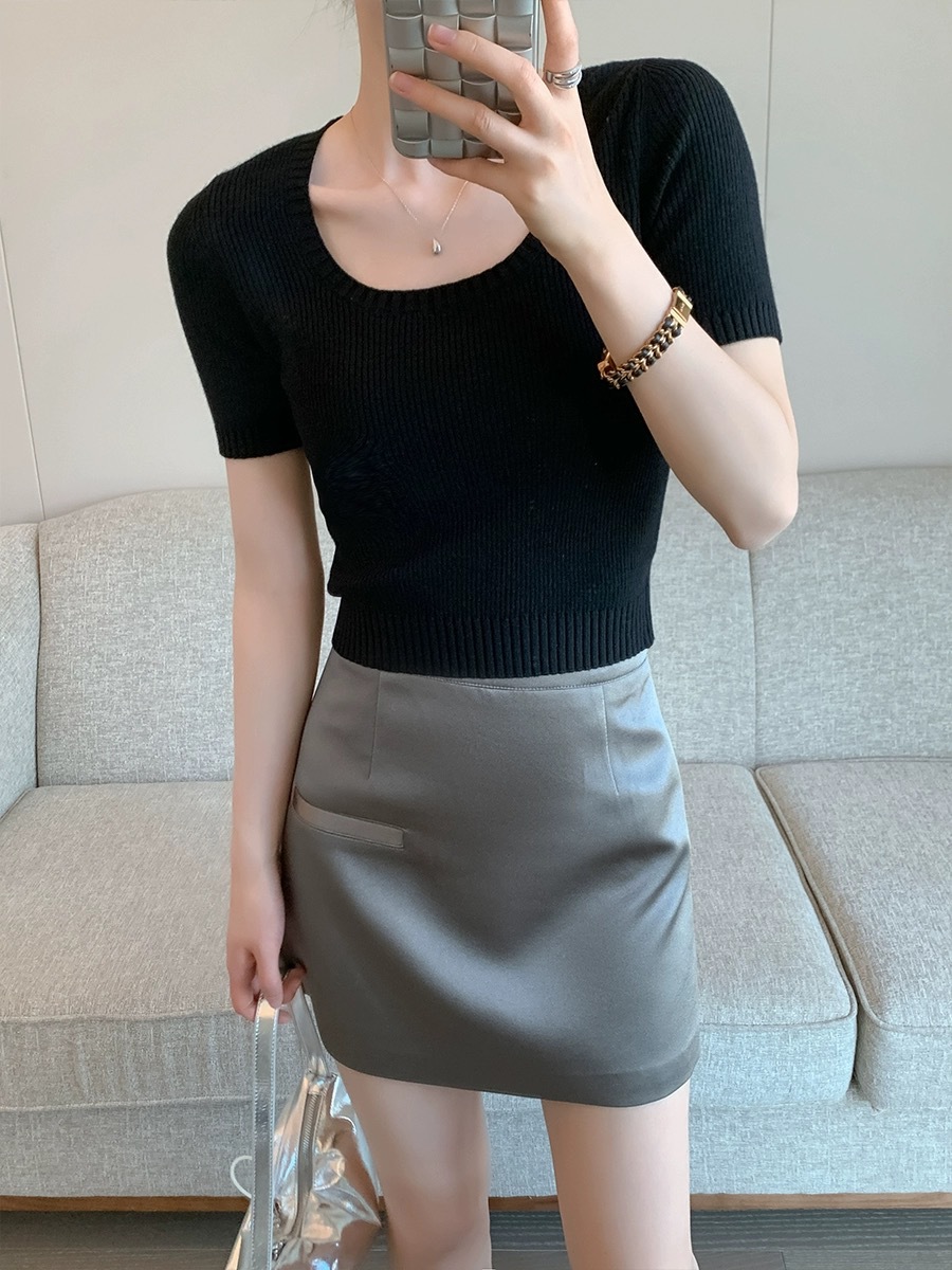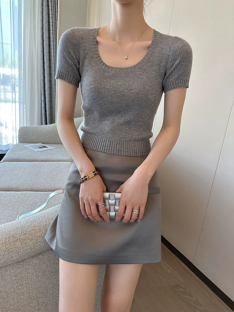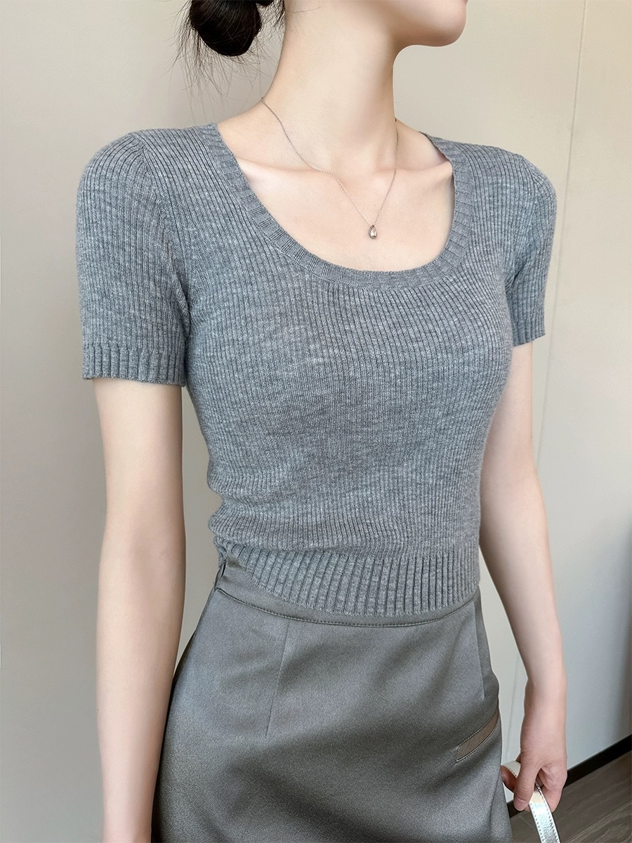 그레이 U 넥 반팔 니트 티셔츠 여성 여름 2025 뉴 프렌치 스타일 젠틀 슬림 피트 슬리밍 쇼트 탑스토어 가기