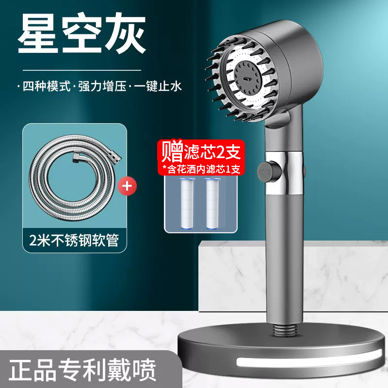 • [그레이세트2] 마사지 브러시가 포함된 강력한 가압 필터 샤워기 + 방폭 호스 2m개 + 필터 엘리먼트 2개