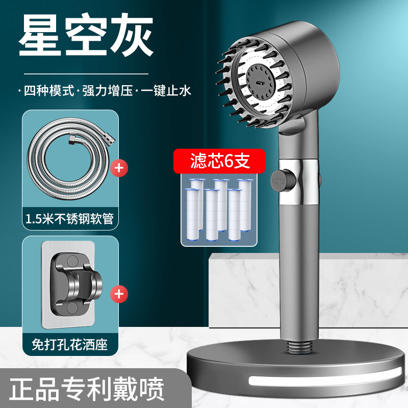 • [그레이세트6] 마사지 브러시가 포함된 강력한 가압 필터 샤워기 + 방폭 호스 1.5m개 + 펀치프리 브라켓 + 필터엘리먼트 6개