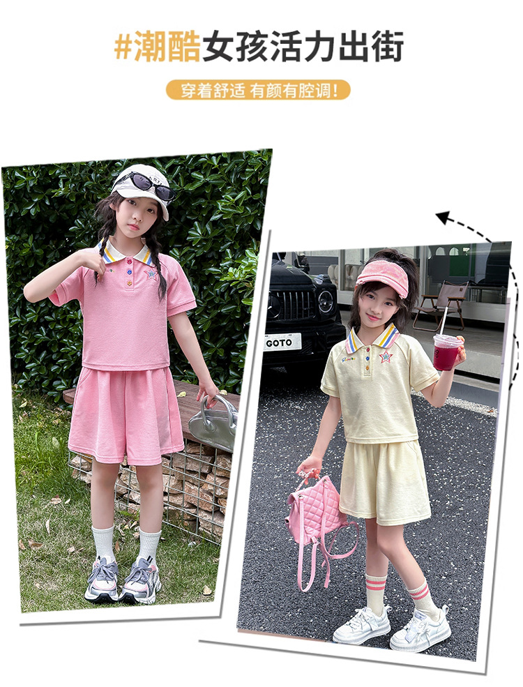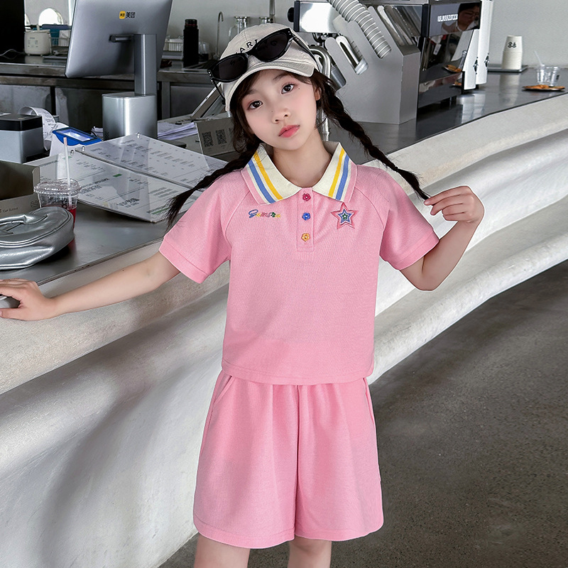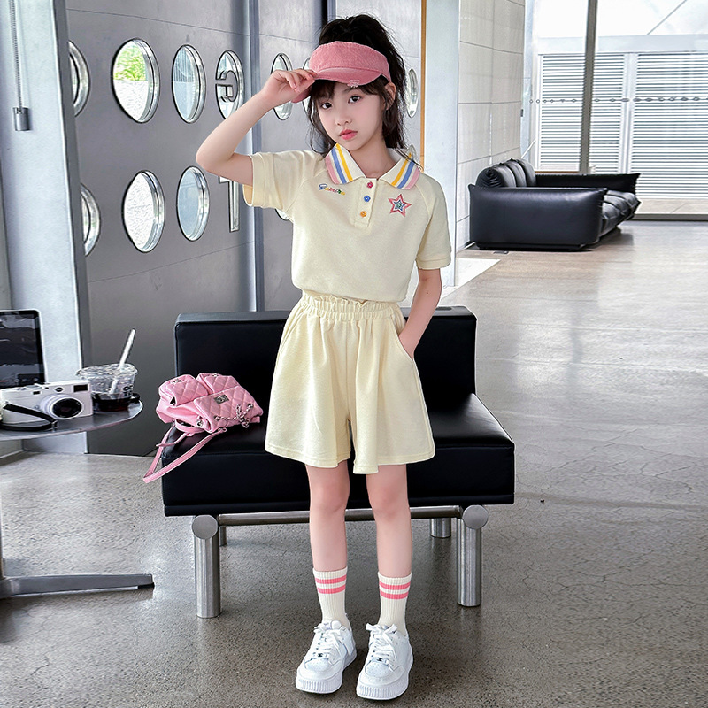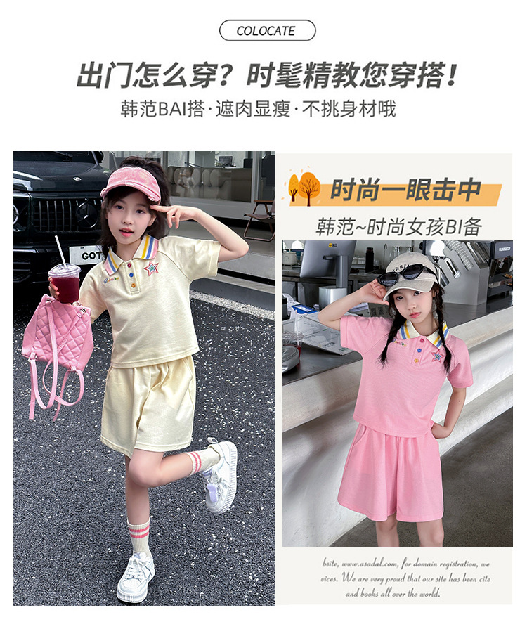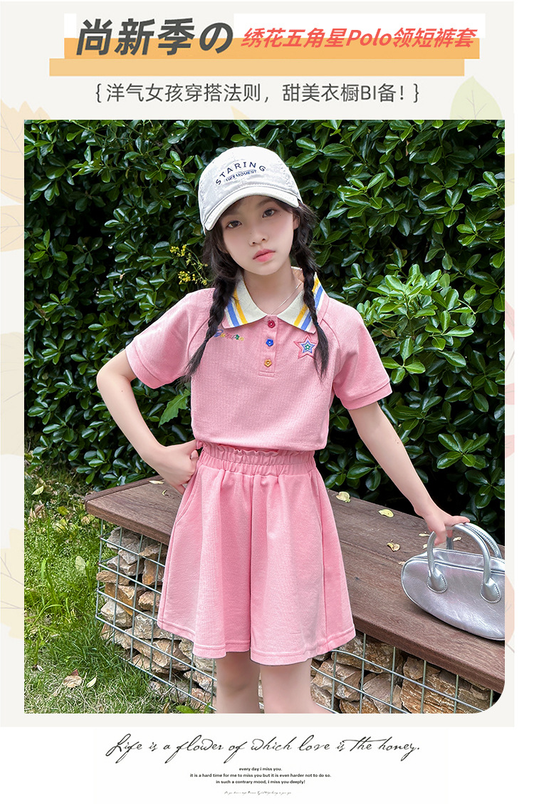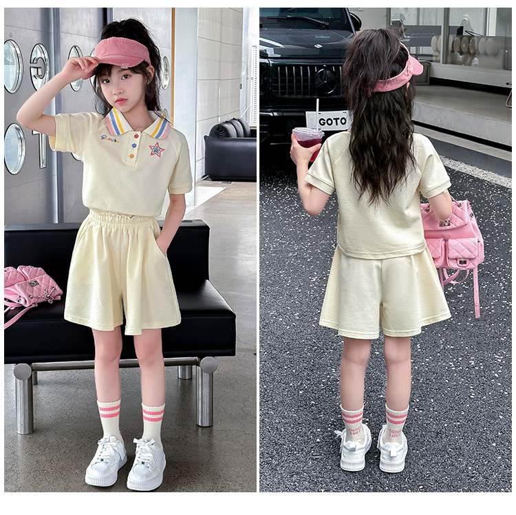 여자 여름 패션 폴로 세트 2024 새로운 여성의 보물 서양 스타일 자수 5 점 별 폴로 칼라 짧은 바지 세트 트렌디스토어 가기