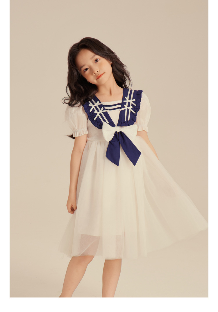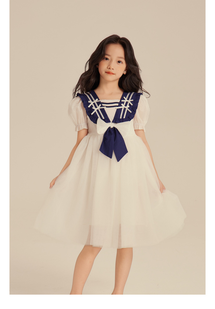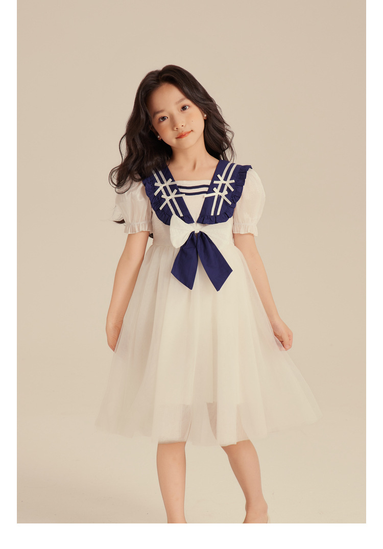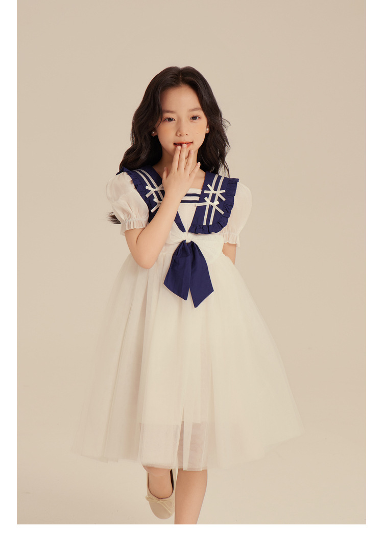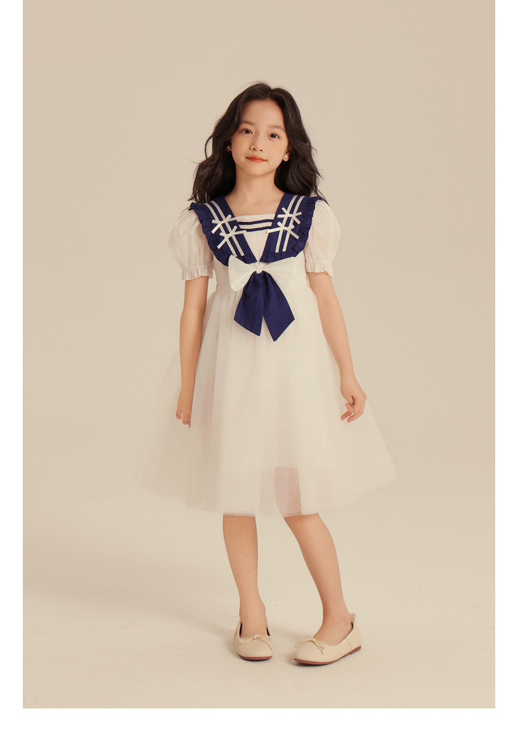 Amybaby Girl's 원피스 2024 새로운 어린이 공주 원피스 네이비 칼라 세련된 여름 폰테 원피스