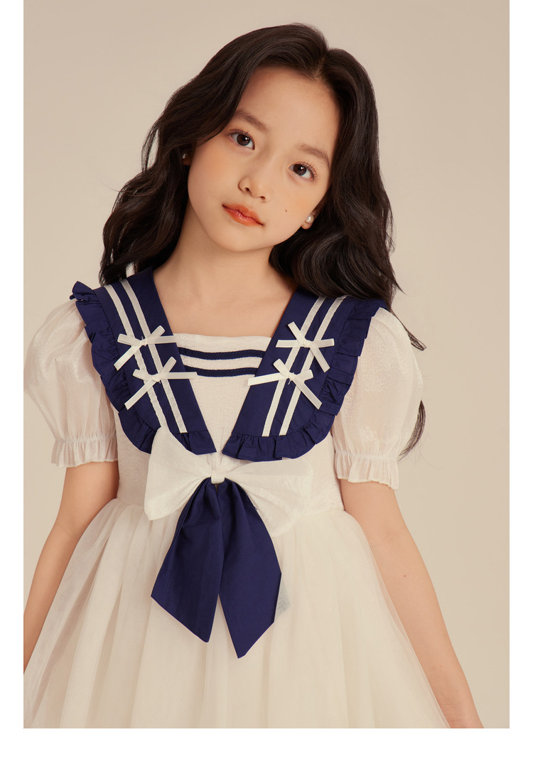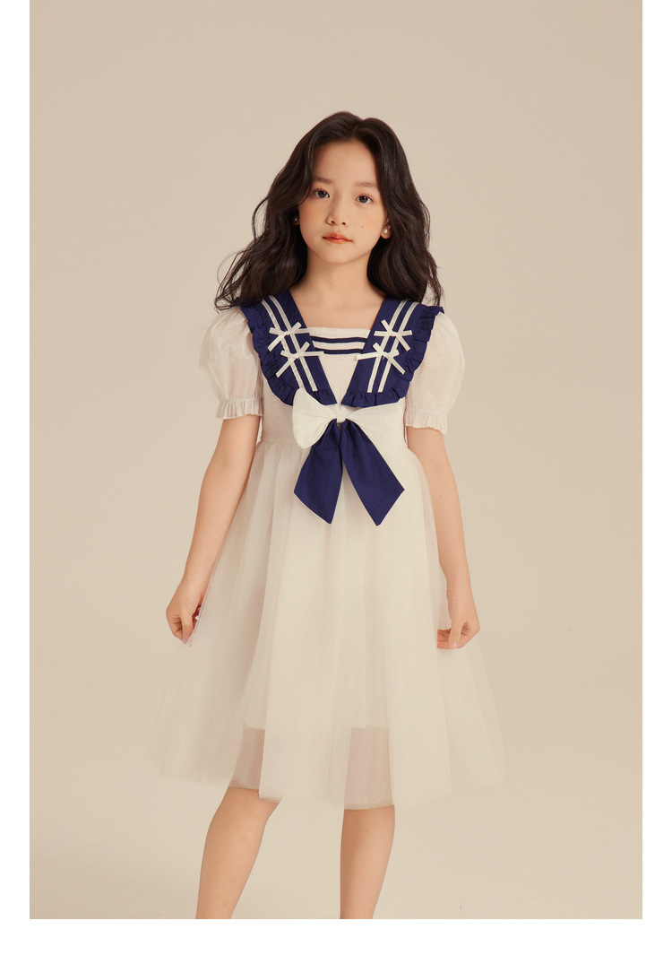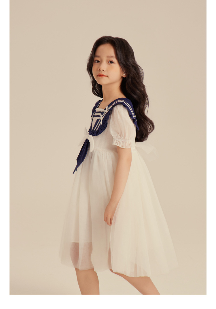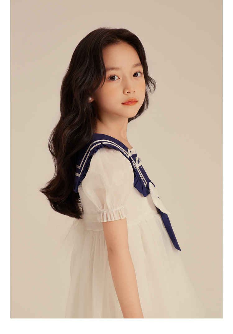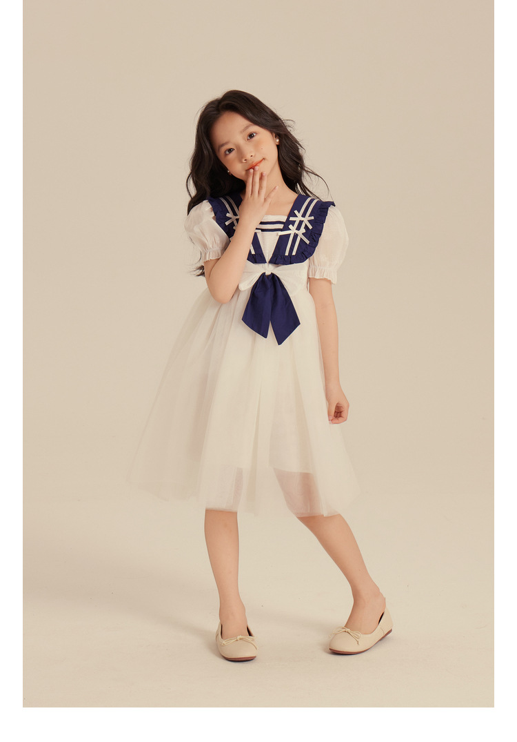 Amybaby Girl's 원피스 2024 새로운 어린이 공주 원피스 네이비 칼라 세련된 여름 폰테 원피스