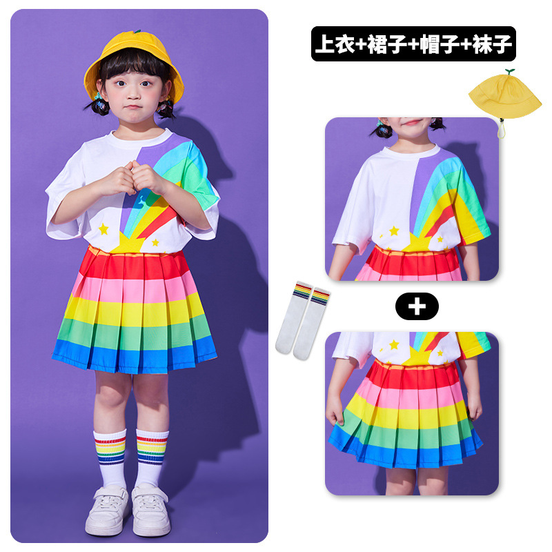 • 세트 [568D 무지개 짧은 소매 591D 무지개 줄무늬 스커트] 노란 어부 모자 무지개 양말