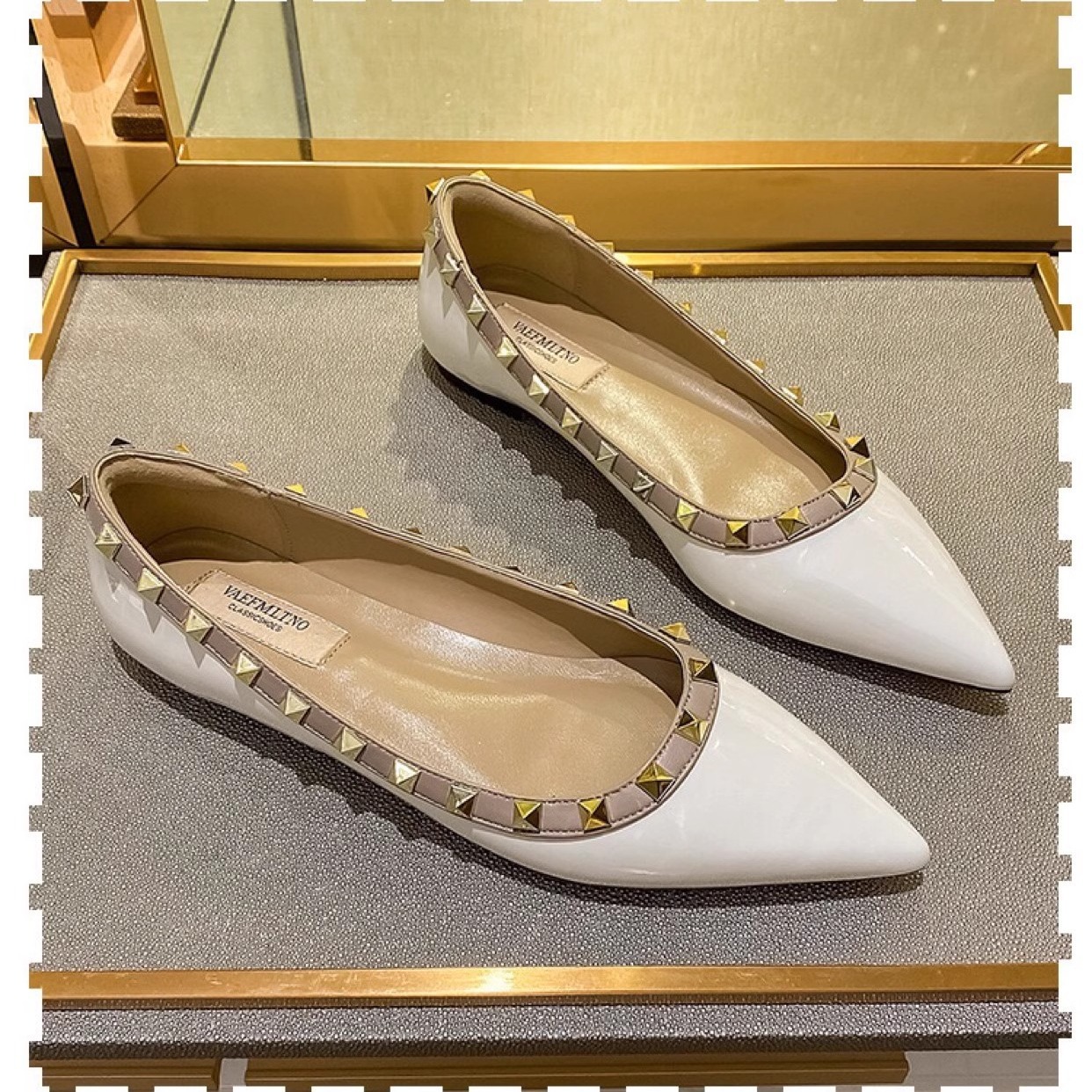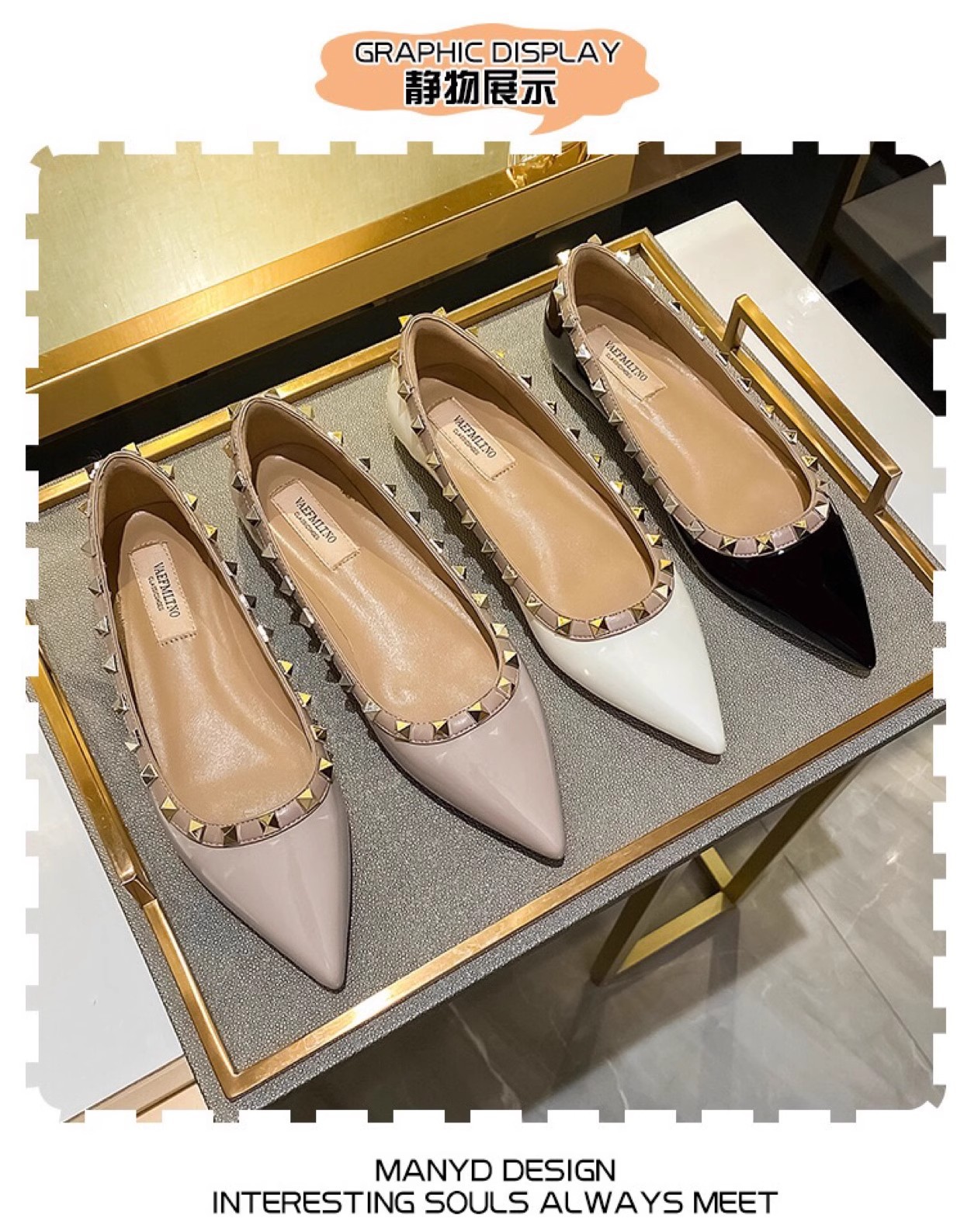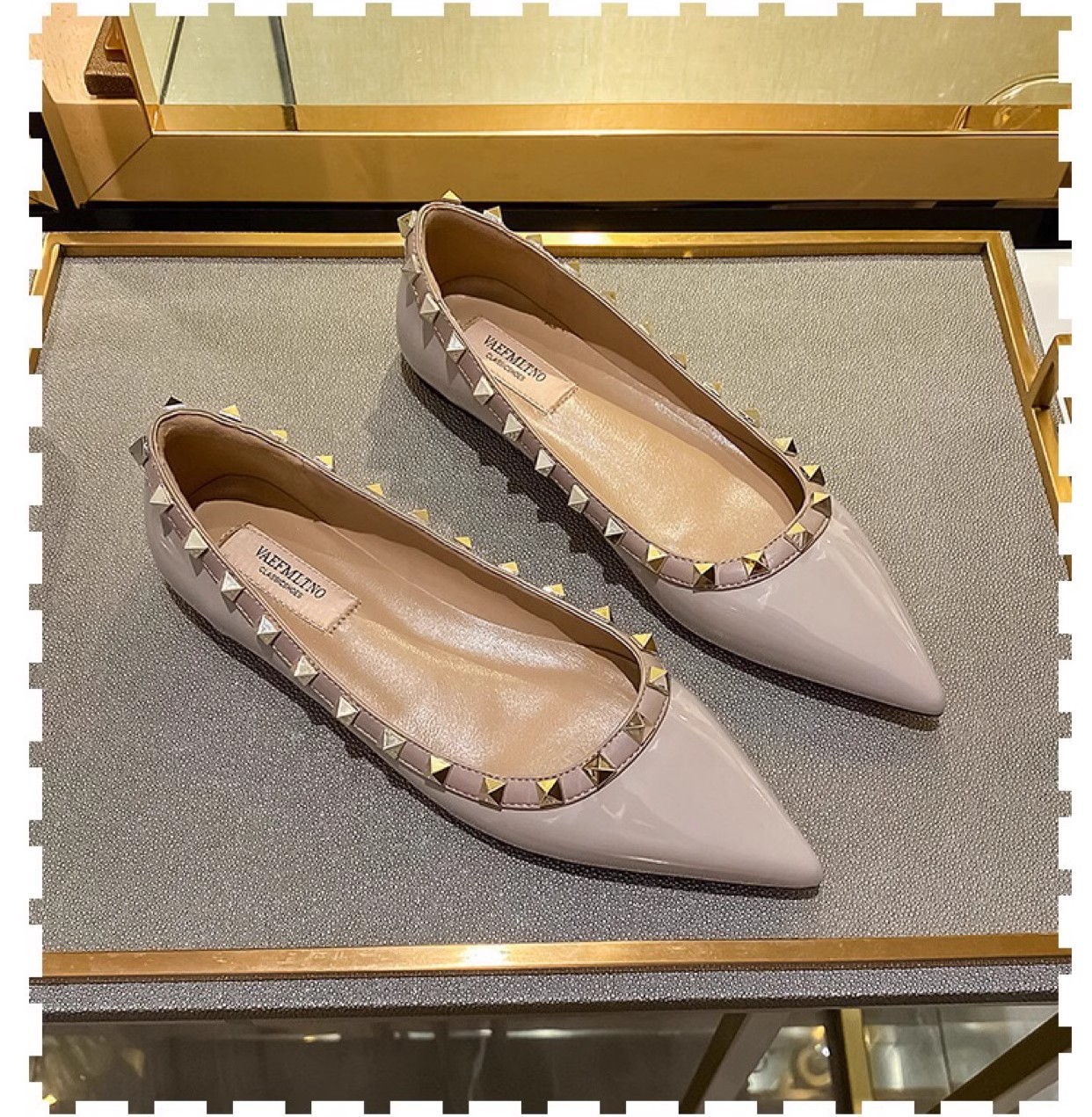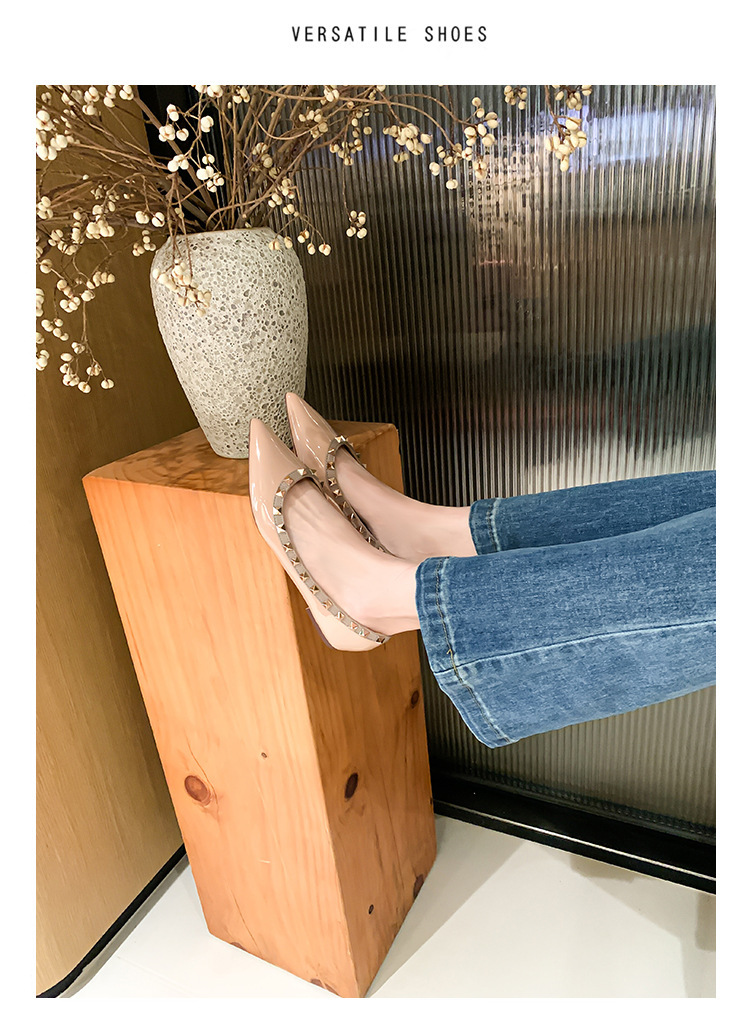재고 ~ V 가족 네일 신발 여성 2024 새로운 패션 얕은 입 부드러운 바닥 조커 특허 가죽 뾰족한 플랫 신발 여성