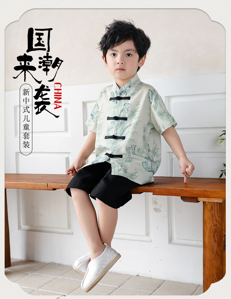 소년 한푸 국립 스타일 간단한 새로운 중국 버튼 얇은 셔츠 반바지 세트 탕 세트 고대 스타일 캐주얼 어린이 원피스스토어 가기
