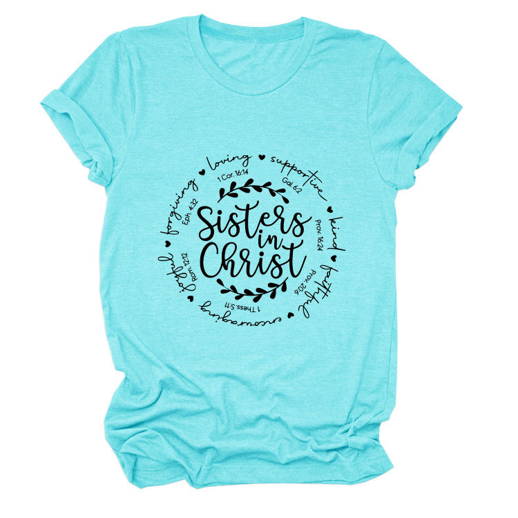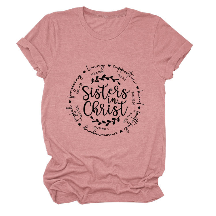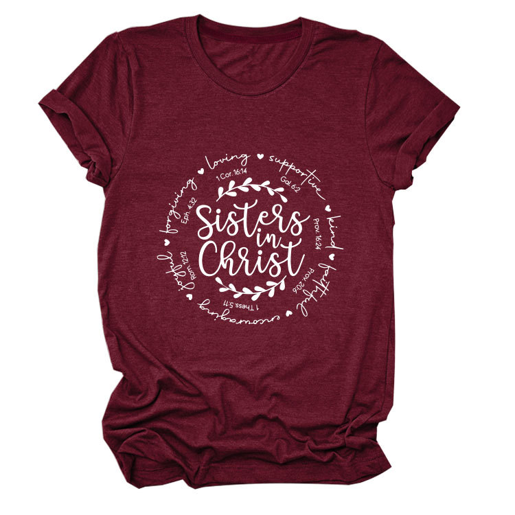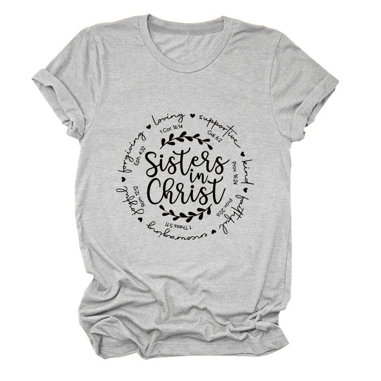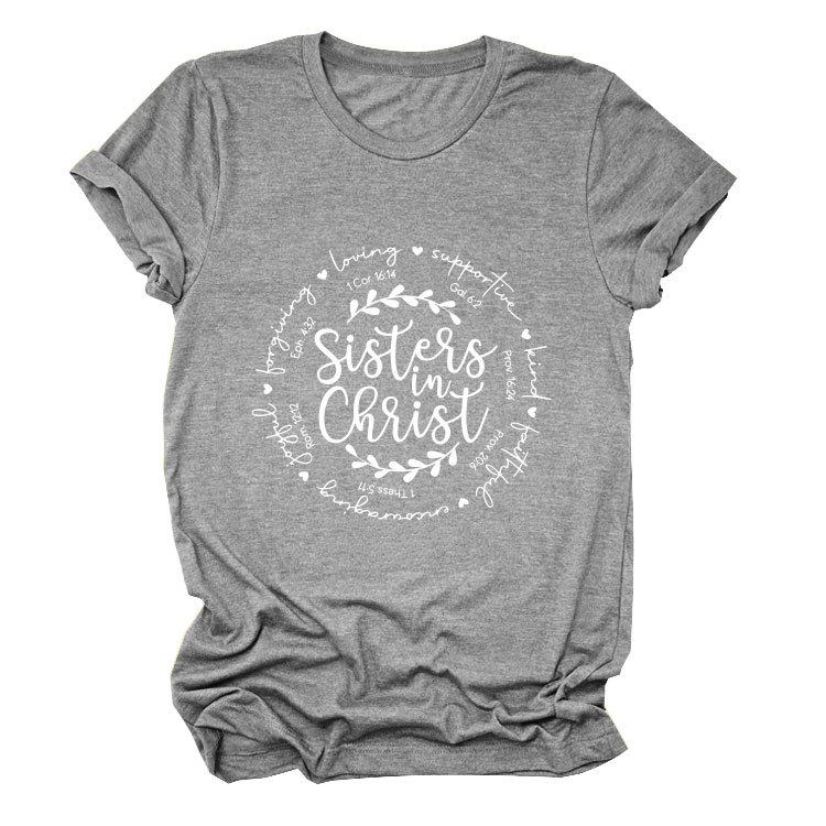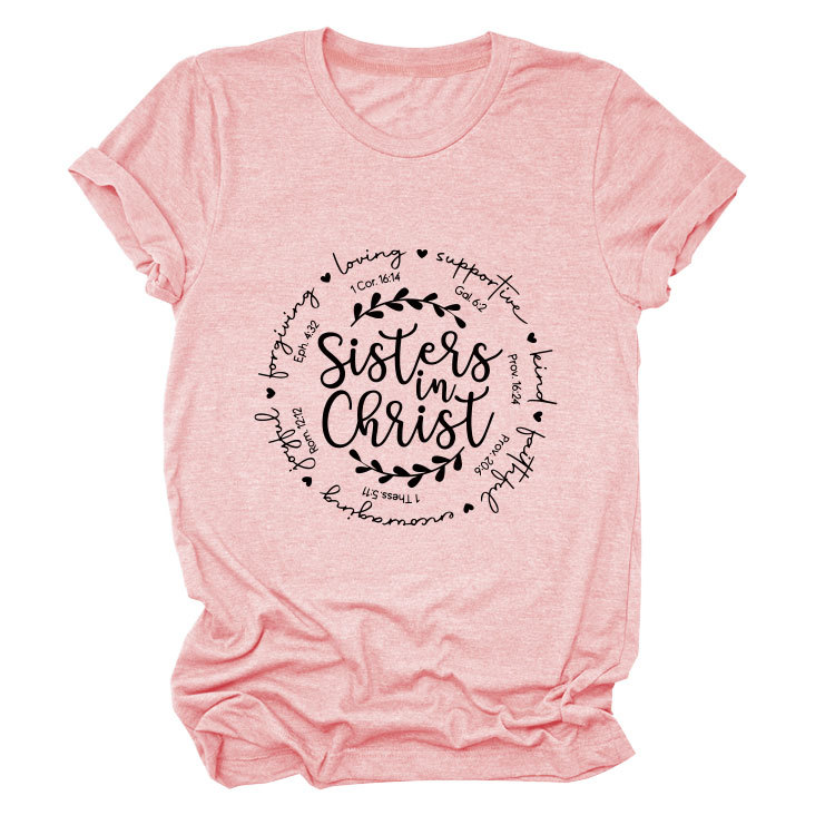 유럽과 미국의 캐주얼 크루 넥 여성 반팔 사랑을지지하는 자매, 그리스도 루즈 티셔츠