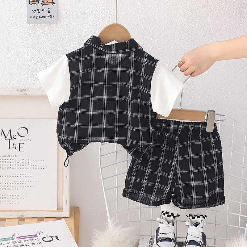 남자들의 여름 세트 2024 서양식 아기 여름 잘 생긴 옷 어린이 격자 무늬 반팔 반바지 투피스 유행 세트