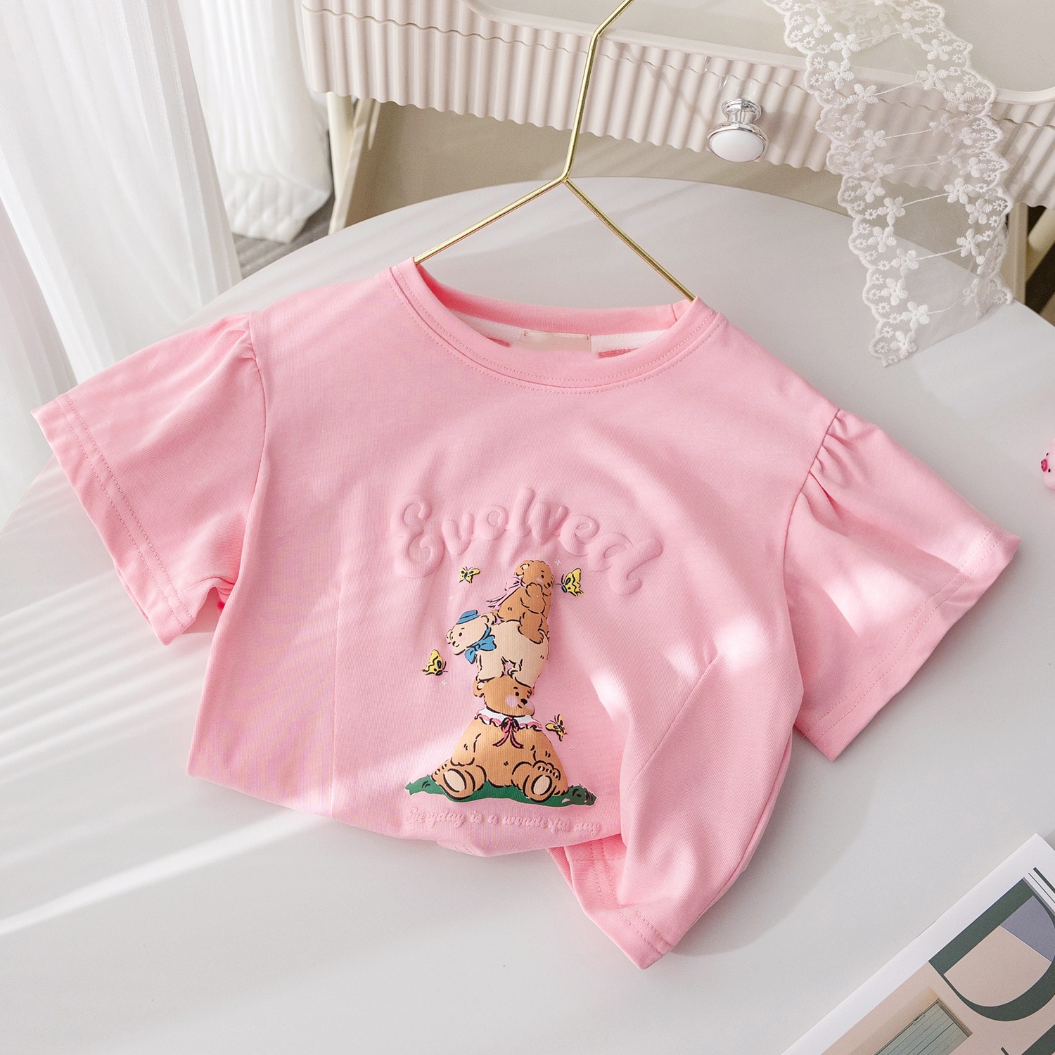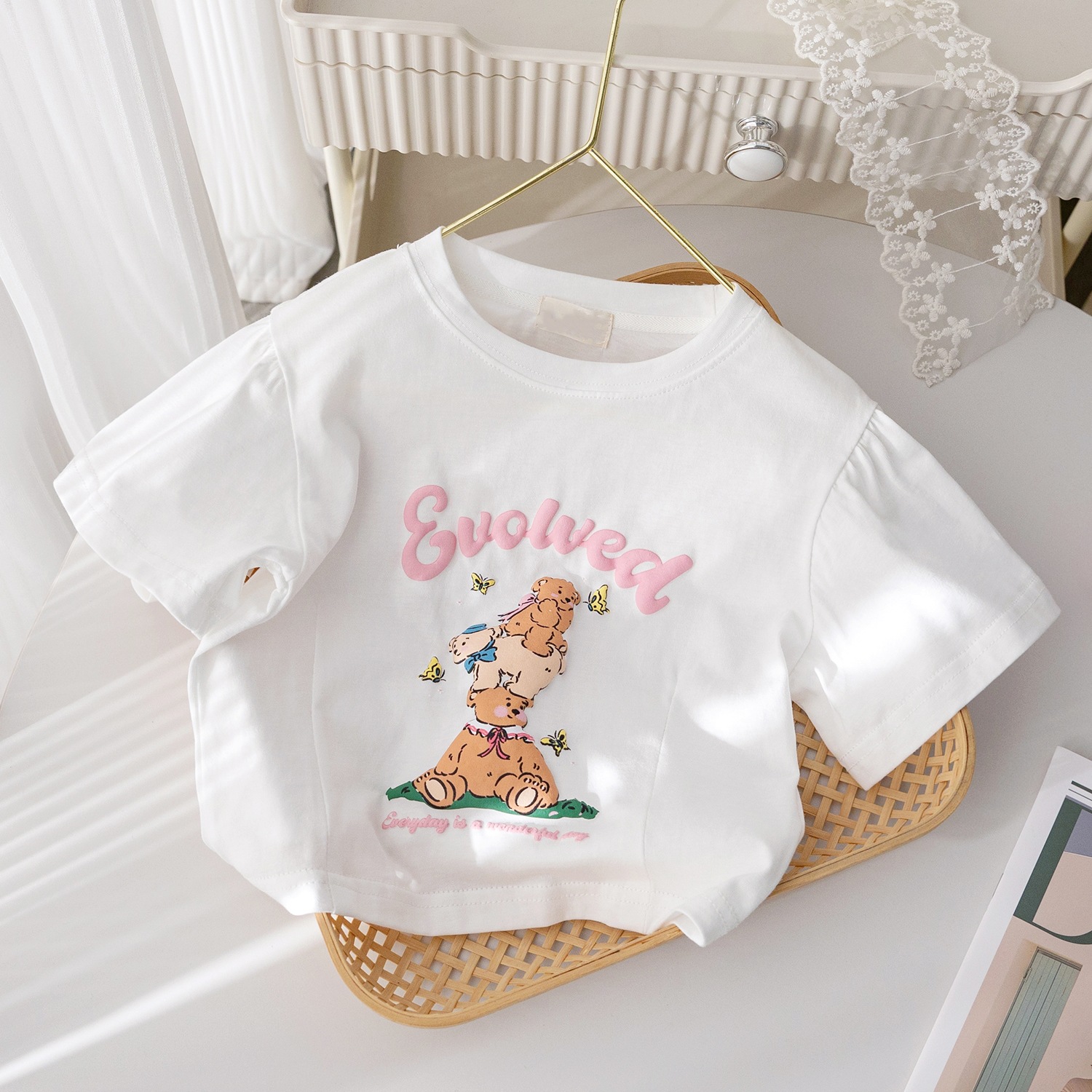 여자 여름 티셔츠 한국식 입체 거품 곰 반팔 탑 걸스 여름 느슨한 T 옷을 인쇄