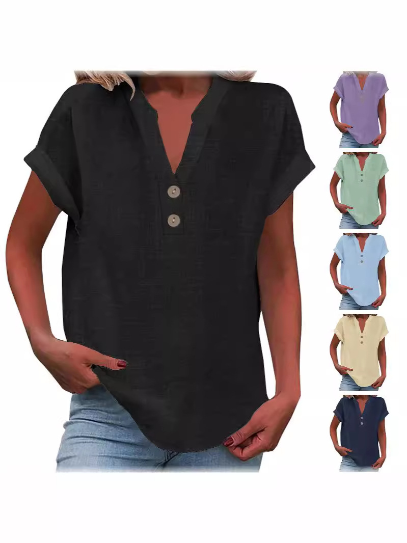 AliExpress 2024 유럽과 미국의 여름 단색 수직 칼라 버튼 반팔 여성용 셔츠스토어 가기