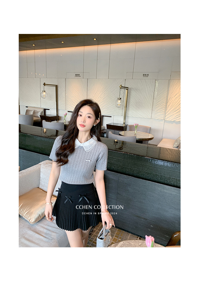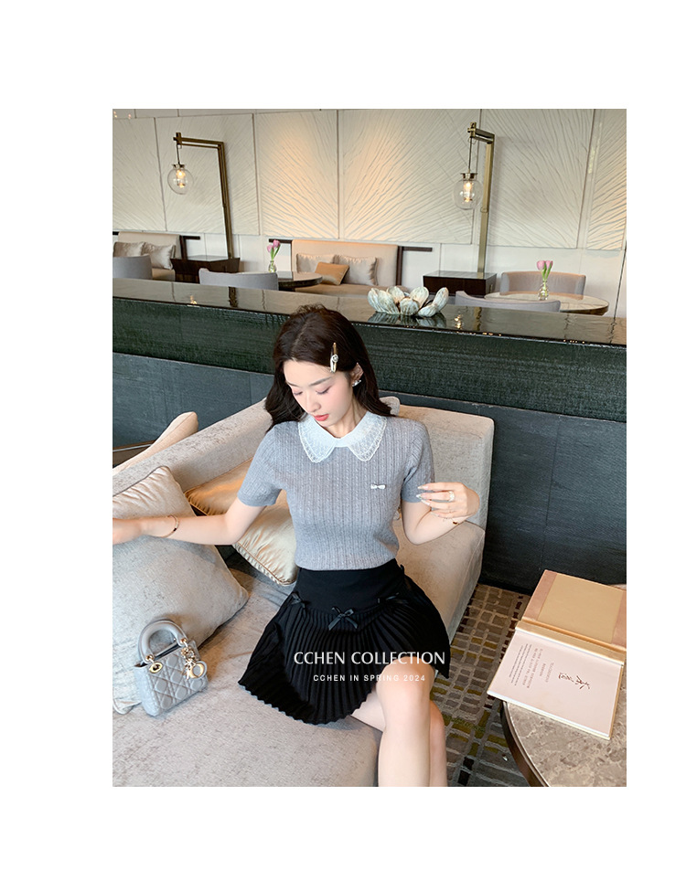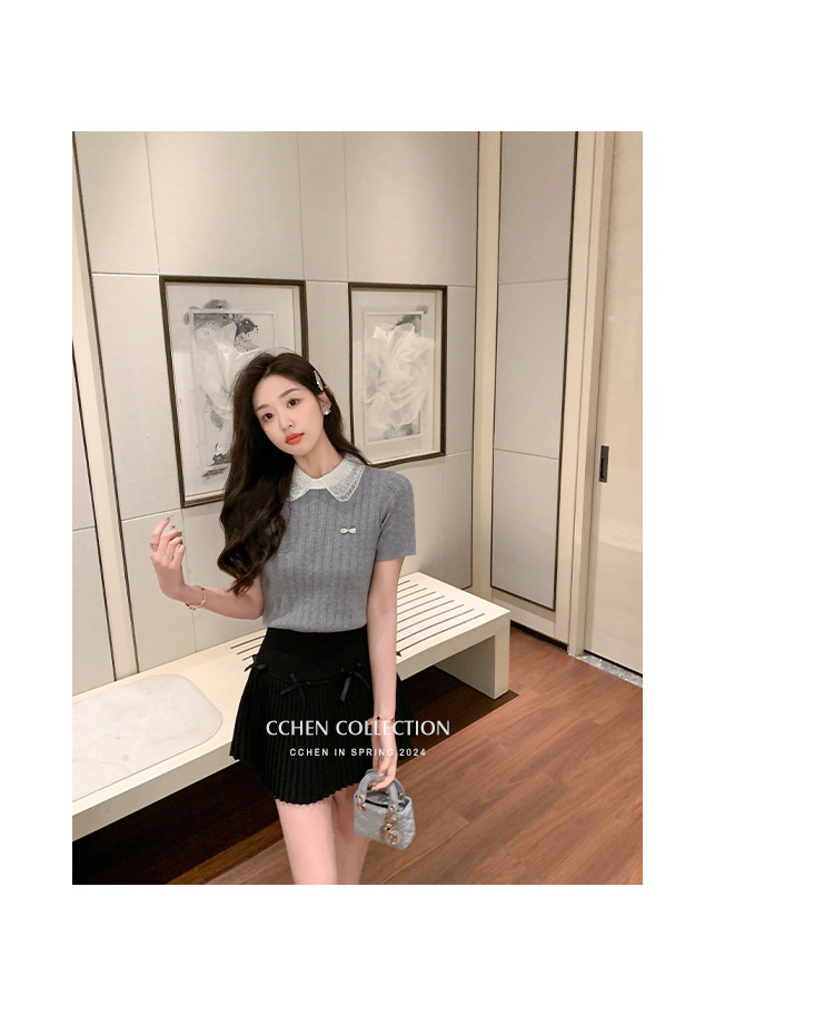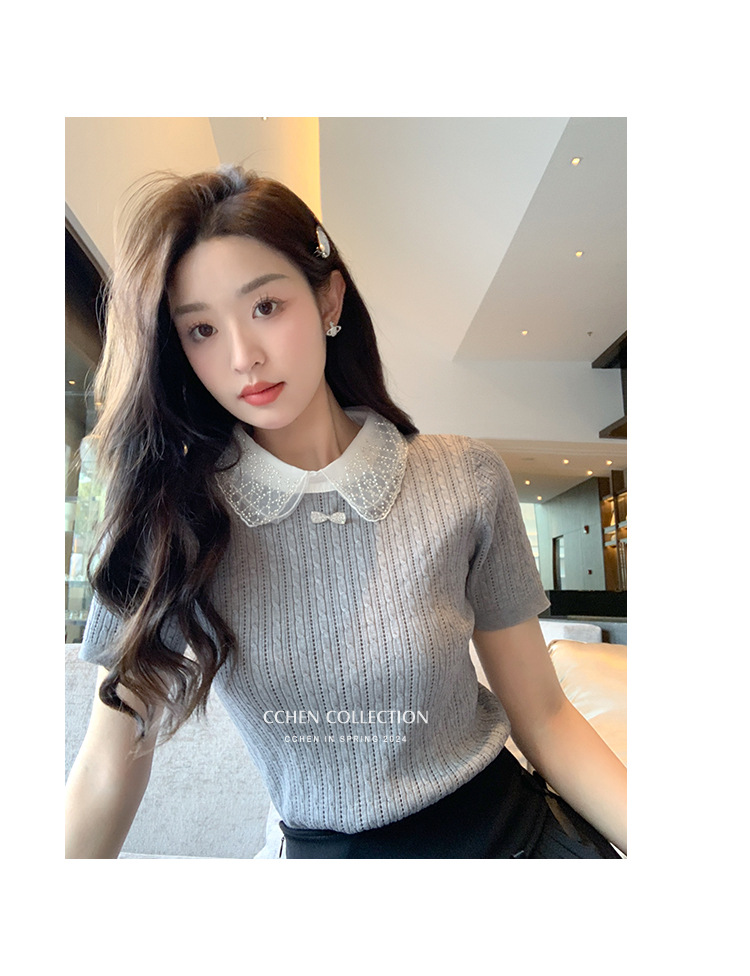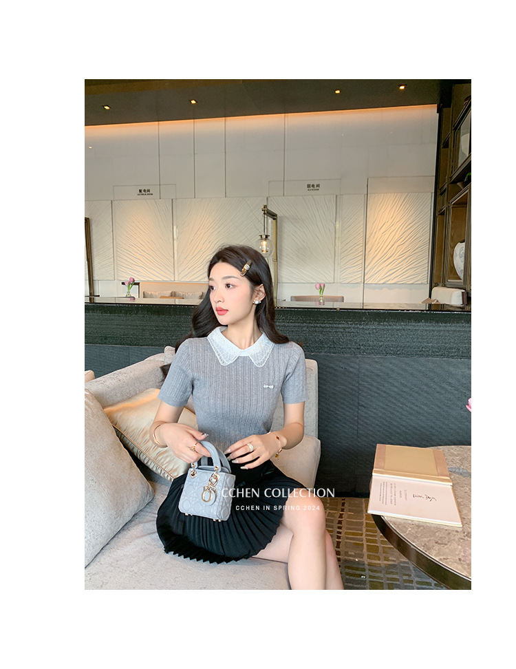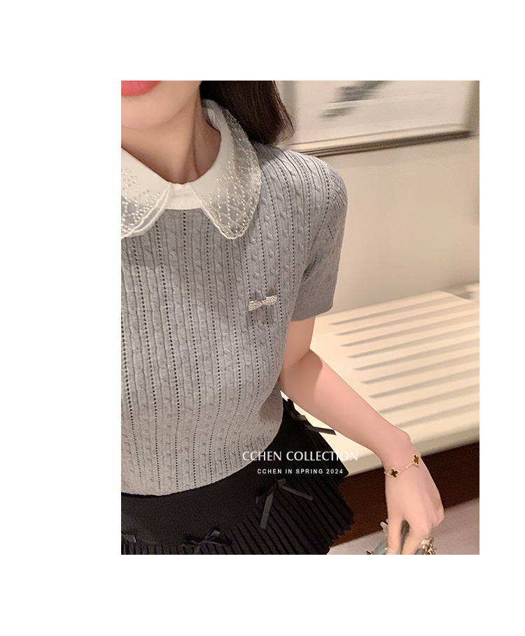 회색 인형 칼라 어깨 반팔 티셔츠 여성용 여름 디자인 센스 니쉬 슬림 핏 슈퍼 잘 생긴 짧은 니트 탑
