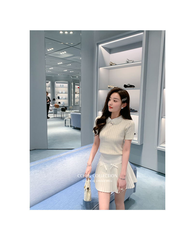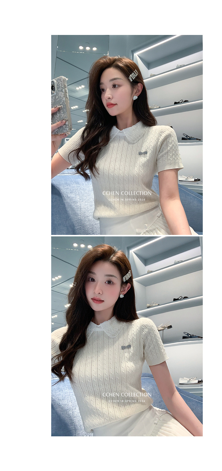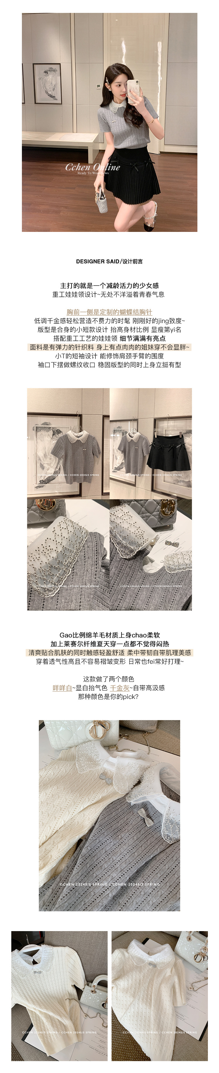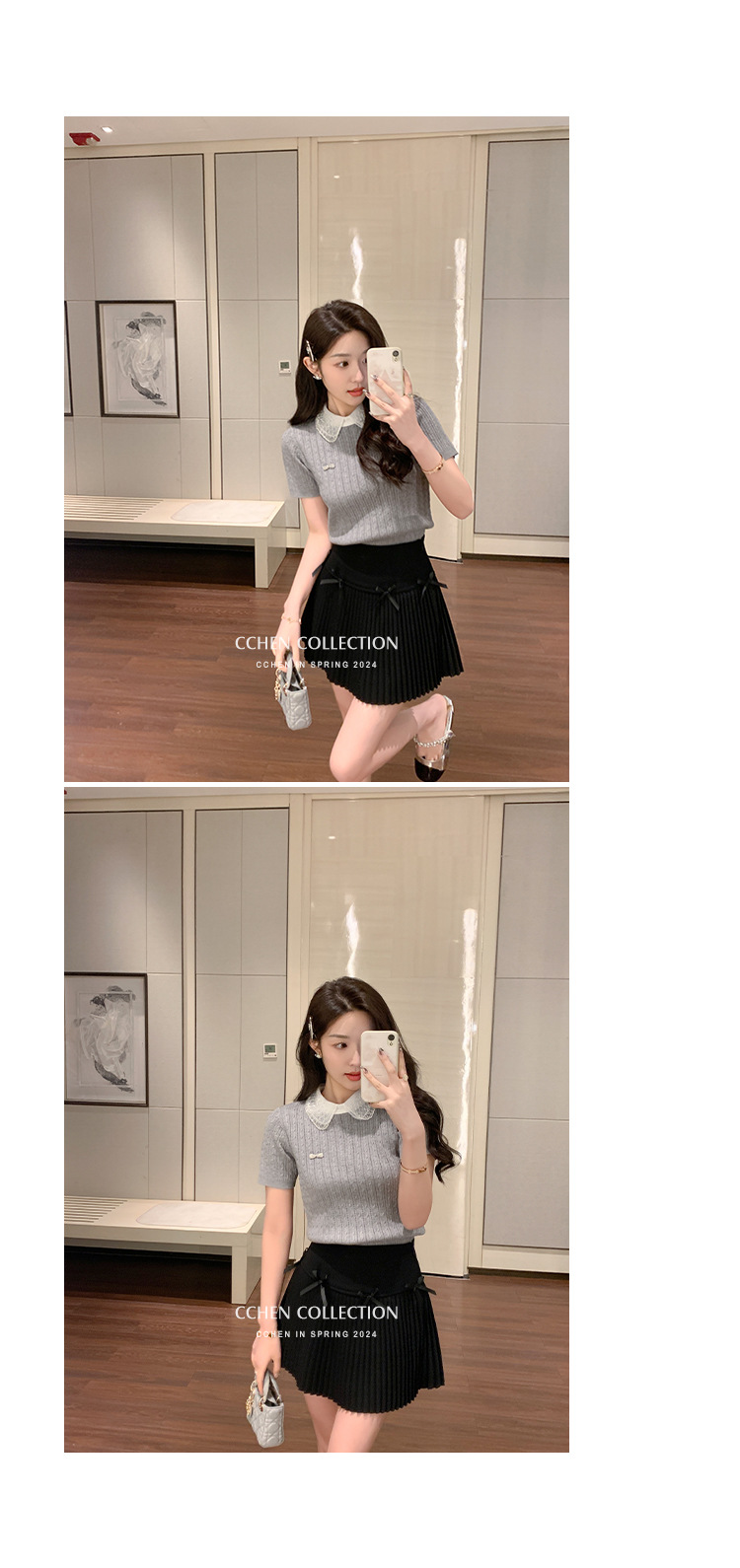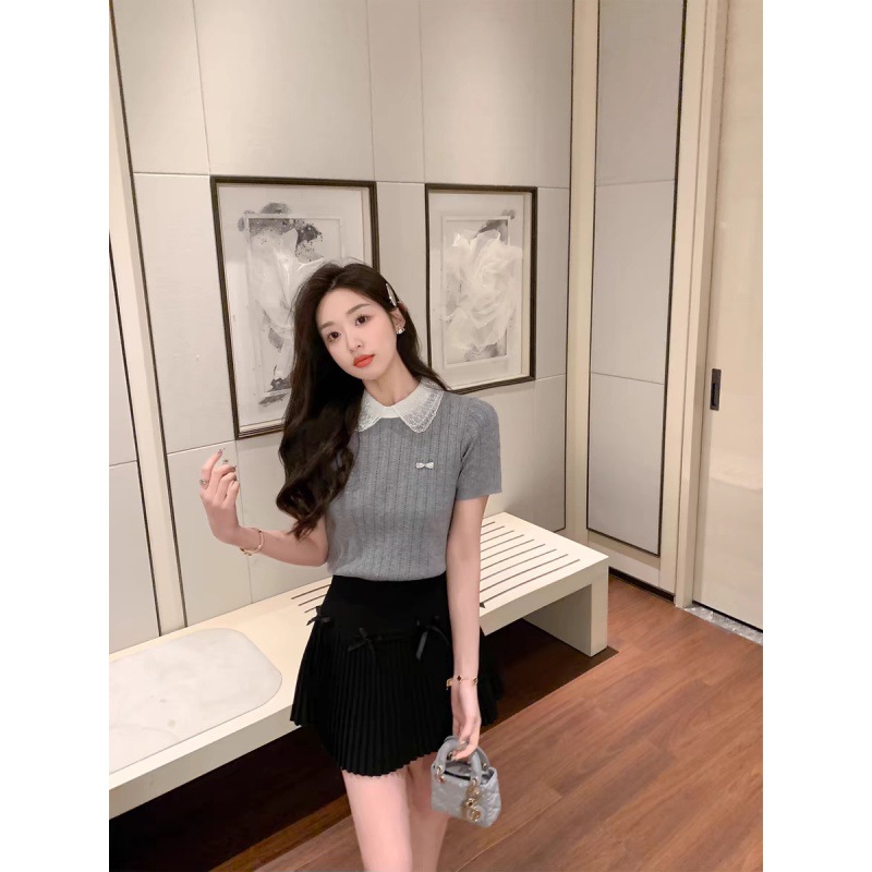 회색 인형 칼라 어깨 반팔 티셔츠 여성용 여름 디자인 센스 니쉬 슬림 핏 슈퍼 잘 생긴 짧은 니트 탑