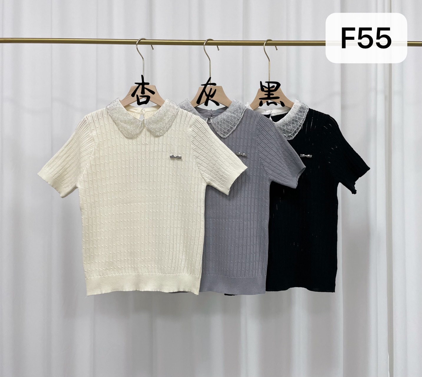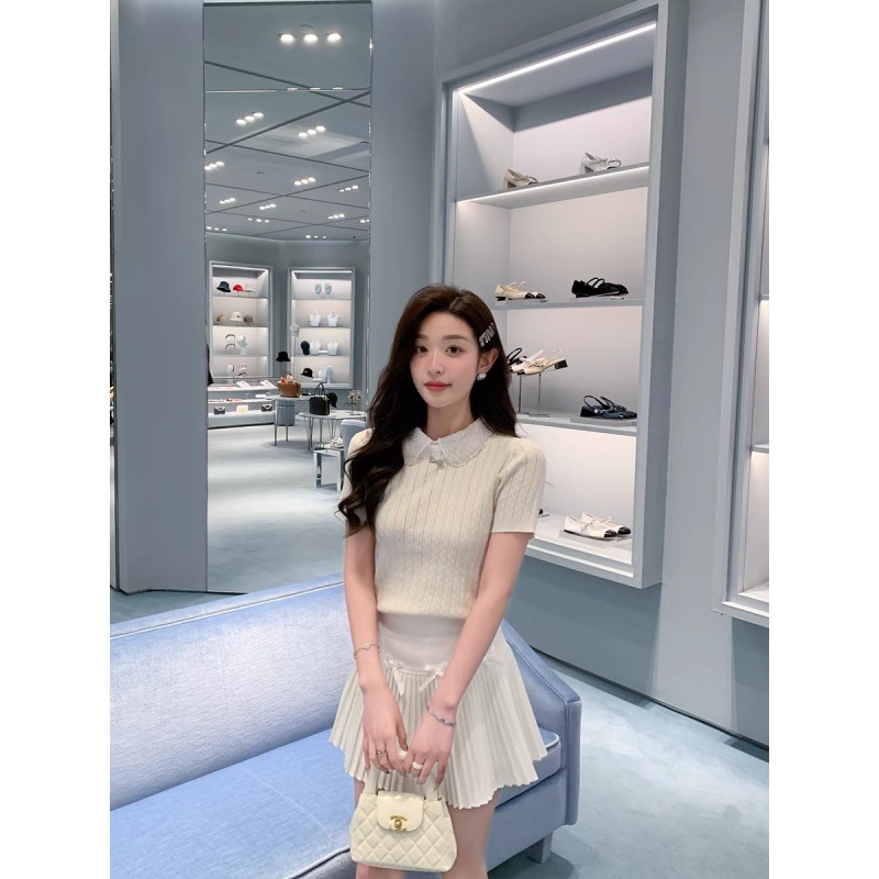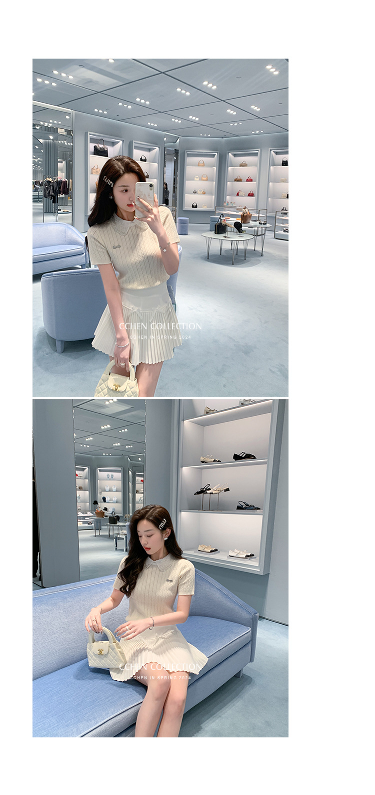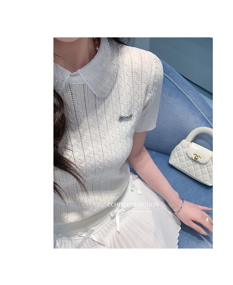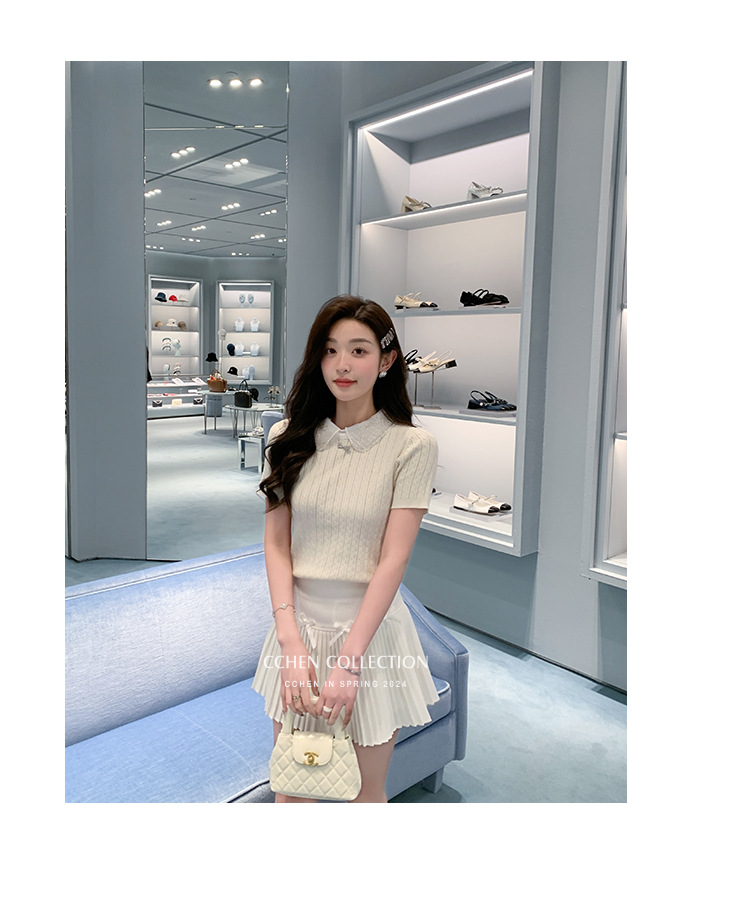 회색 인형 칼라 어깨 반팔 티셔츠 여성용 여름 디자인 센스 니쉬 슬림 핏 슈퍼 잘 생긴 짧은 니트 탑