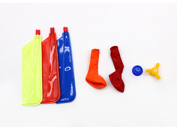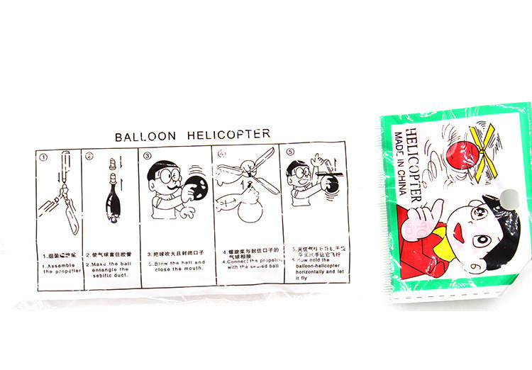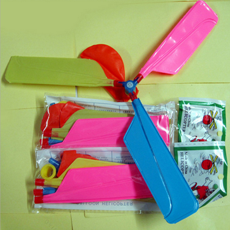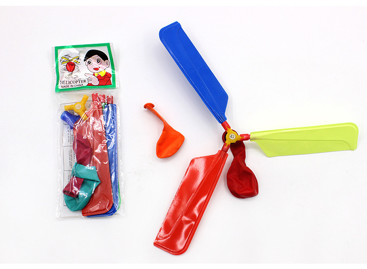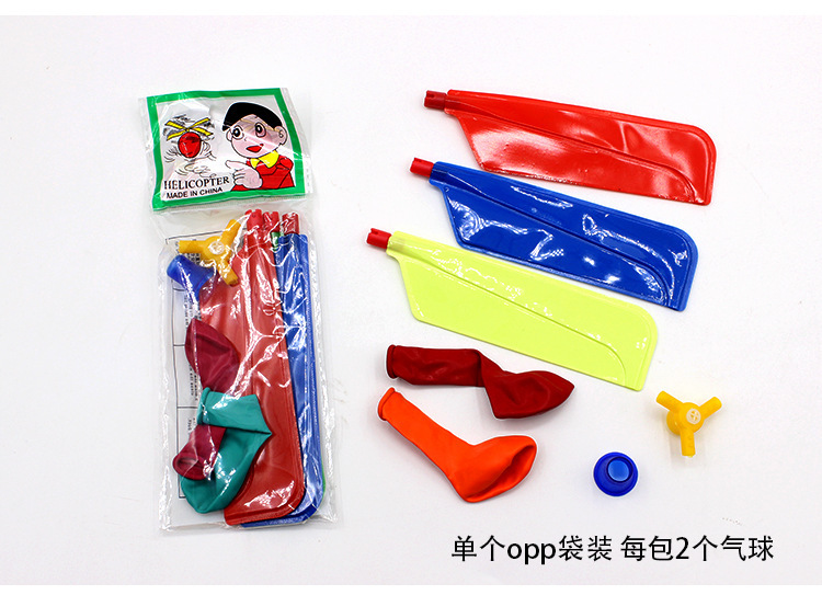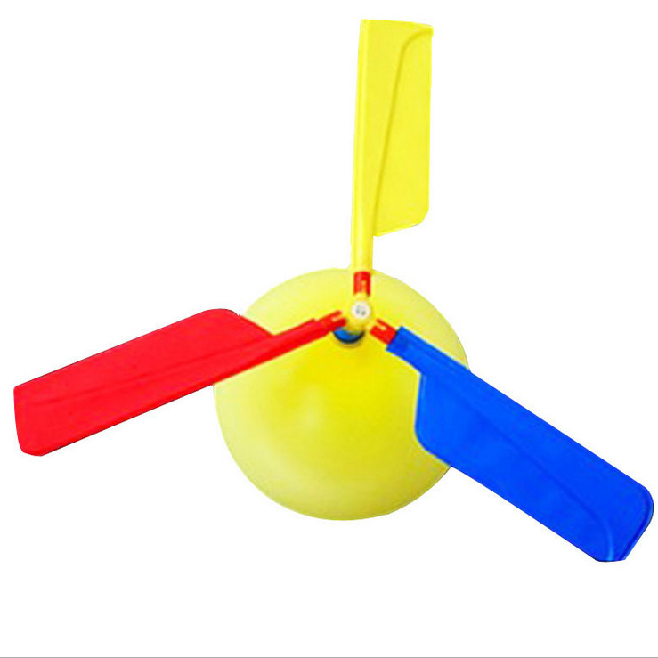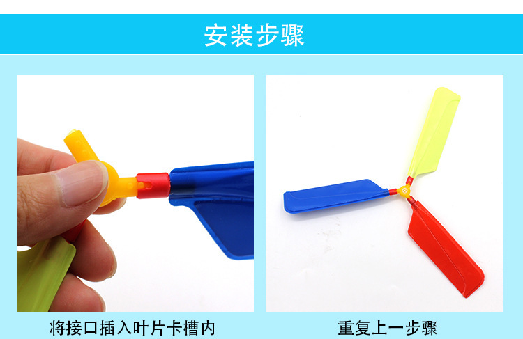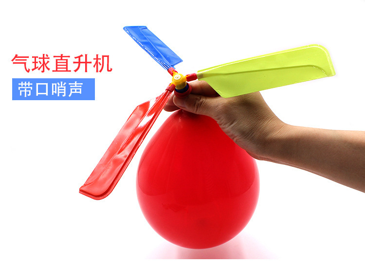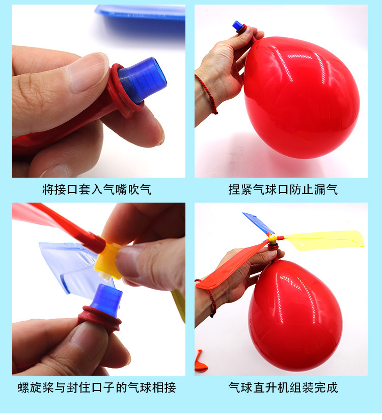 将三片螺旋浆的插口向上组装,将气球套在蓝色塑料管上吹鼓并捏紧气球,再把螺旋桨三通套紧在蓝色塑料管上,接着夹住气球直升机与水平面处放手飞行,随即即可向上飞行,可飞几米高,并且在飞行途中发出悦耳的哨子声。下面有具体的视频哦!!
