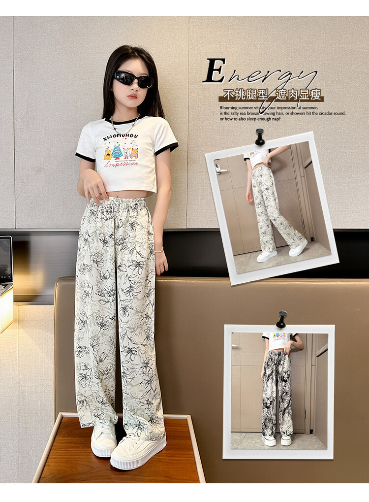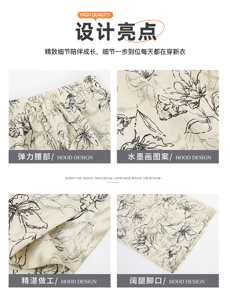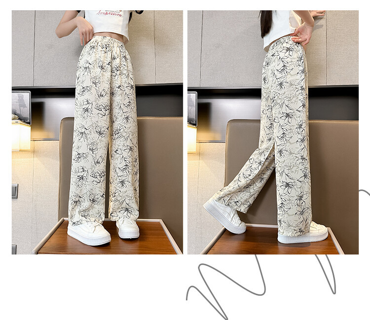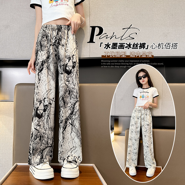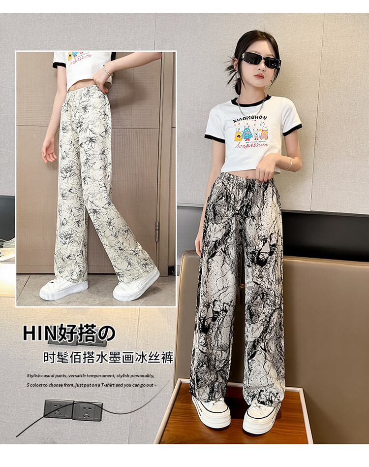 아이스 실크 잉크 그림 넓은 다리 바지 여성 큰 아이 여름 2024 새로운 탄성 높은 허리 포장 캐주얼 와이드 다리 바지스토어 가기