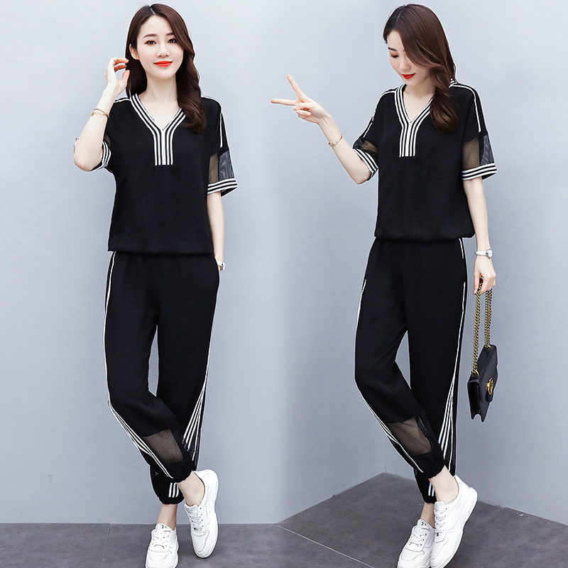 반소매 블랙 한국식 캐주얼 세트 스포츠웨어 여성의 2024 여름 새로운 대형 패션 투피스 세트