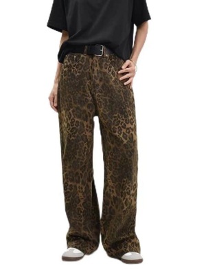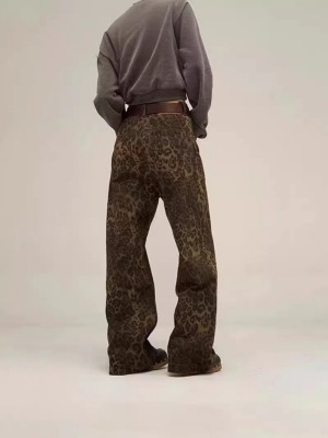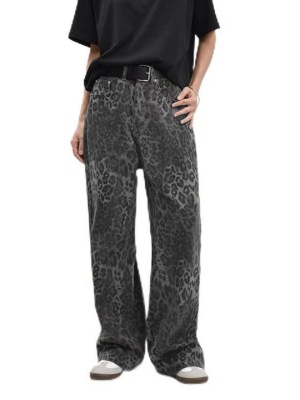 유럽과 미국의 국경 간 대외 무역 레오파드 무늬 복고풍 간단한 캐주얼 직선 세척 물 데님 바지