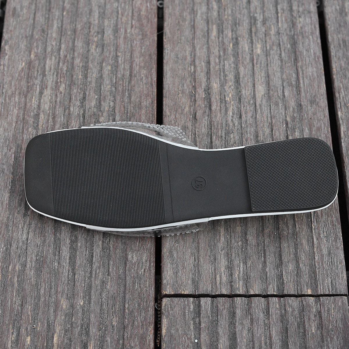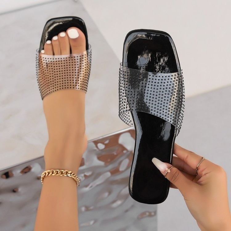 2024 년 새로운 유럽과 미국의 대외 무역 국경 대형 평면 투명 슬리퍼 여성 스퀘어 헤드 1 자 라인 석 레저 아웃
