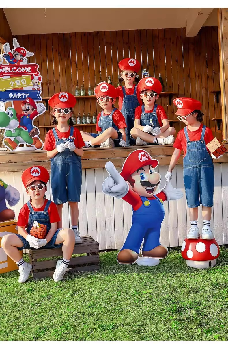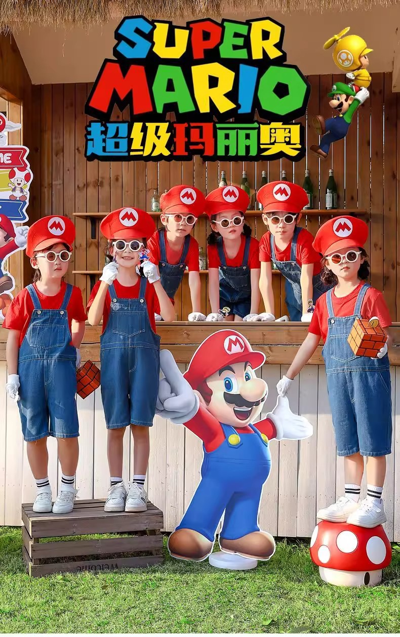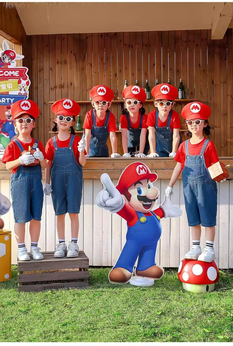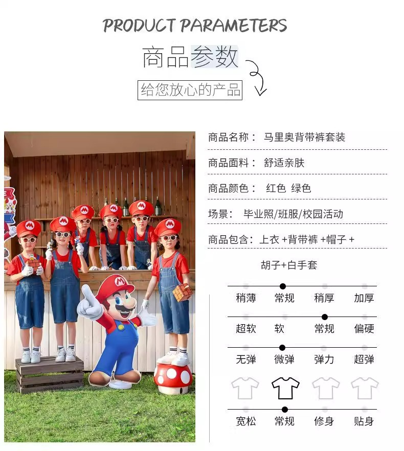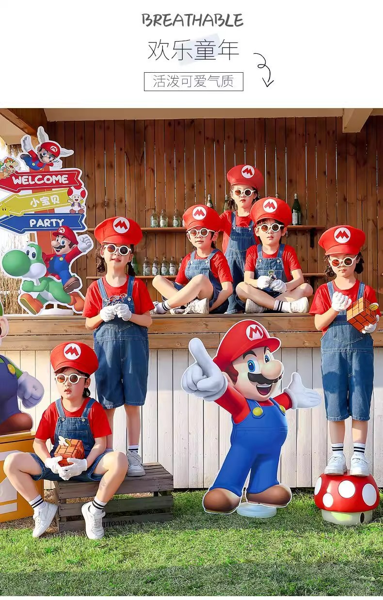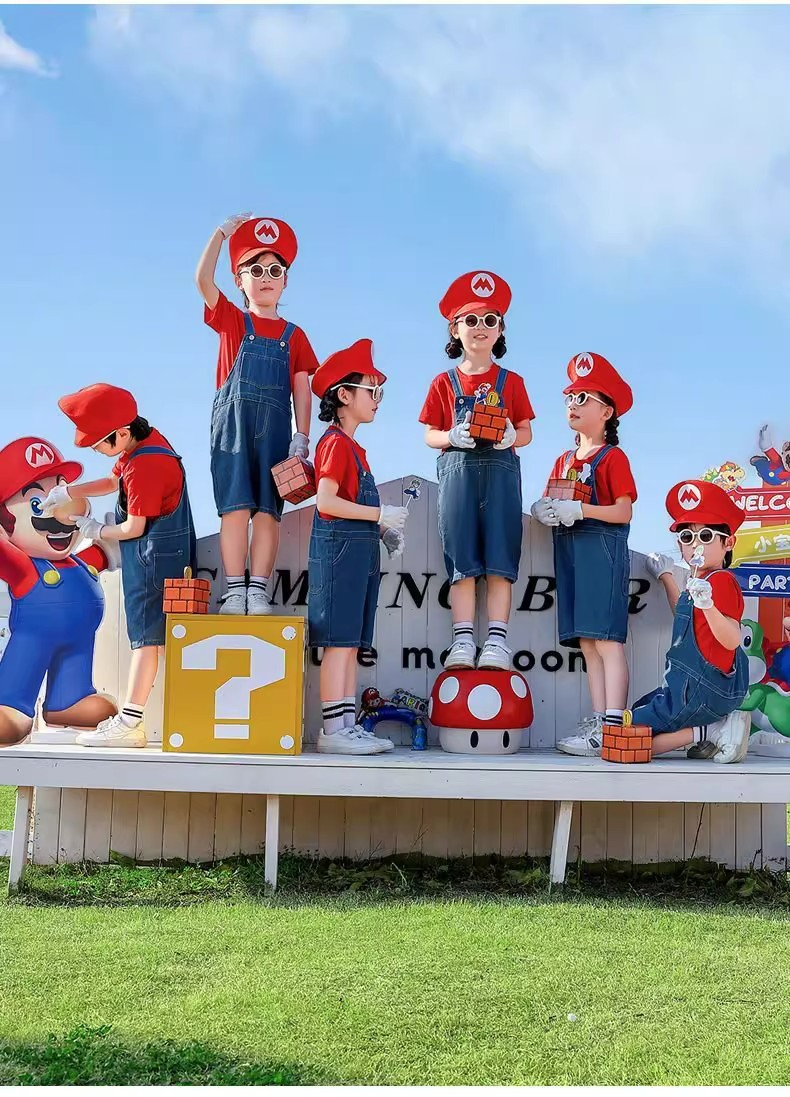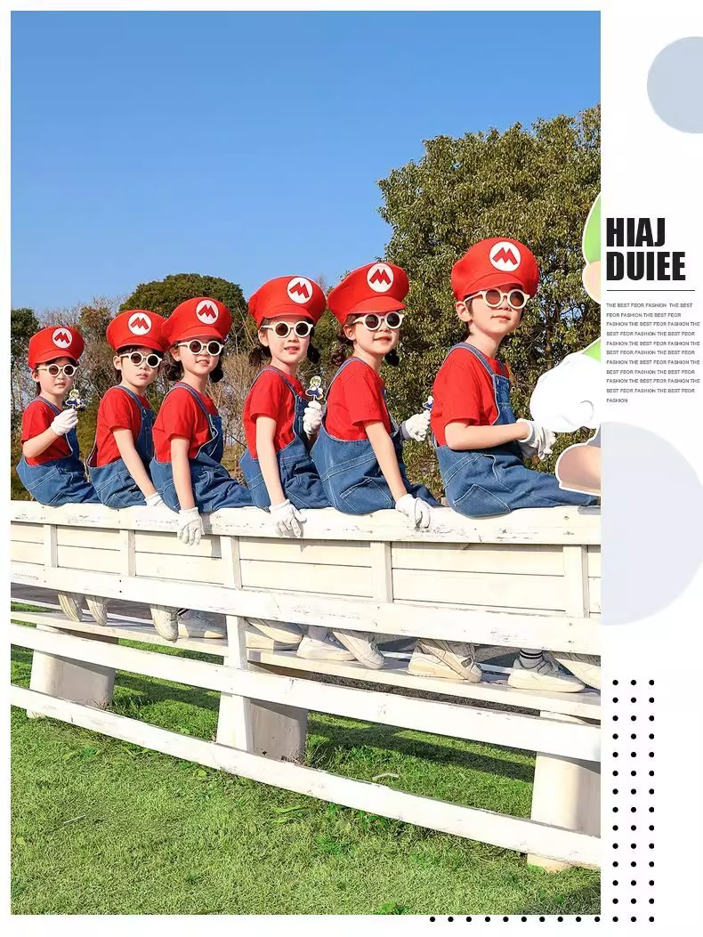 • 파란색 멜빵 바지 + 빨간색 반팔 + 빨간색 모자 + 수염 장갑 빨간색 양말