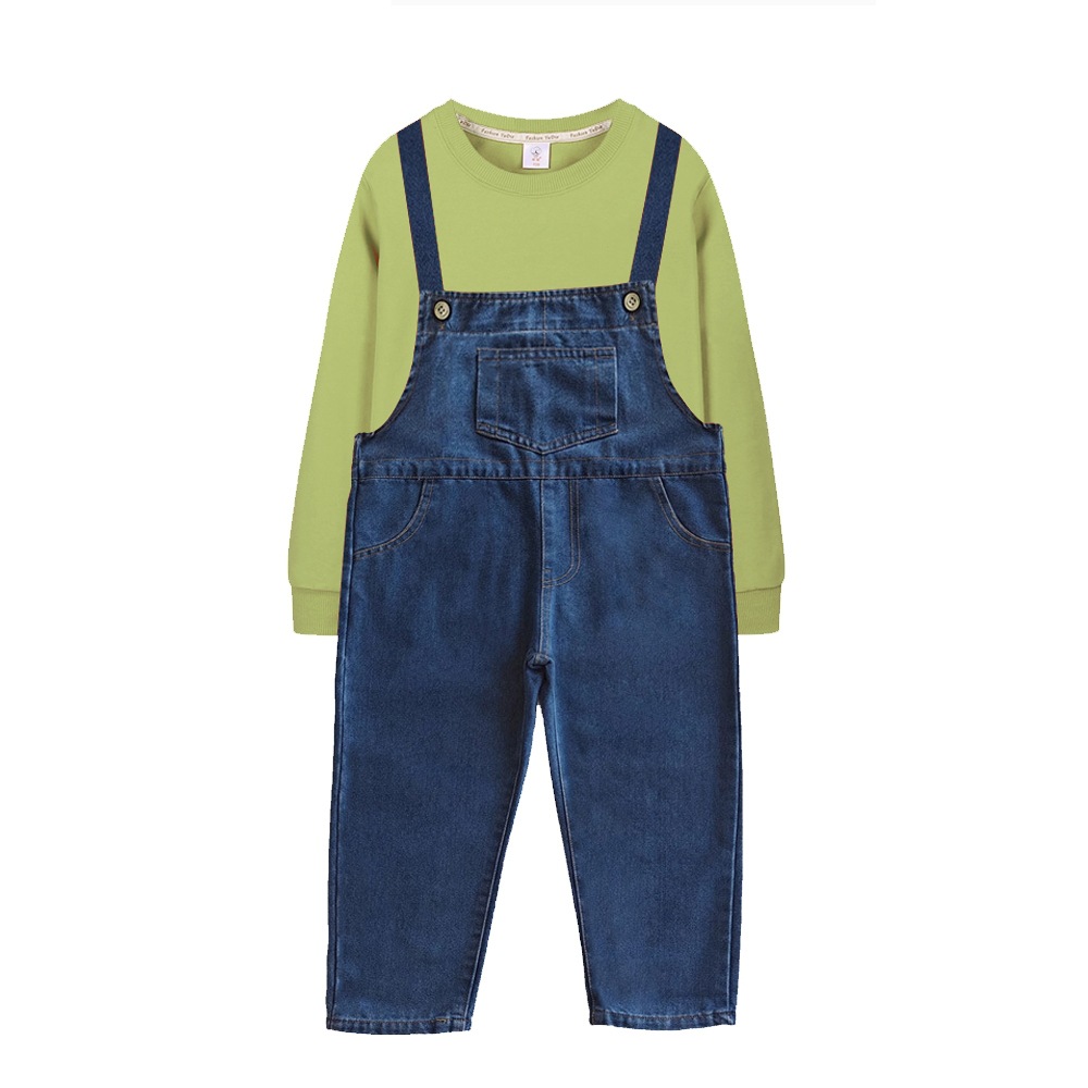 • 파란색 멜빵 바지 + 녹색 스웨트셔츠