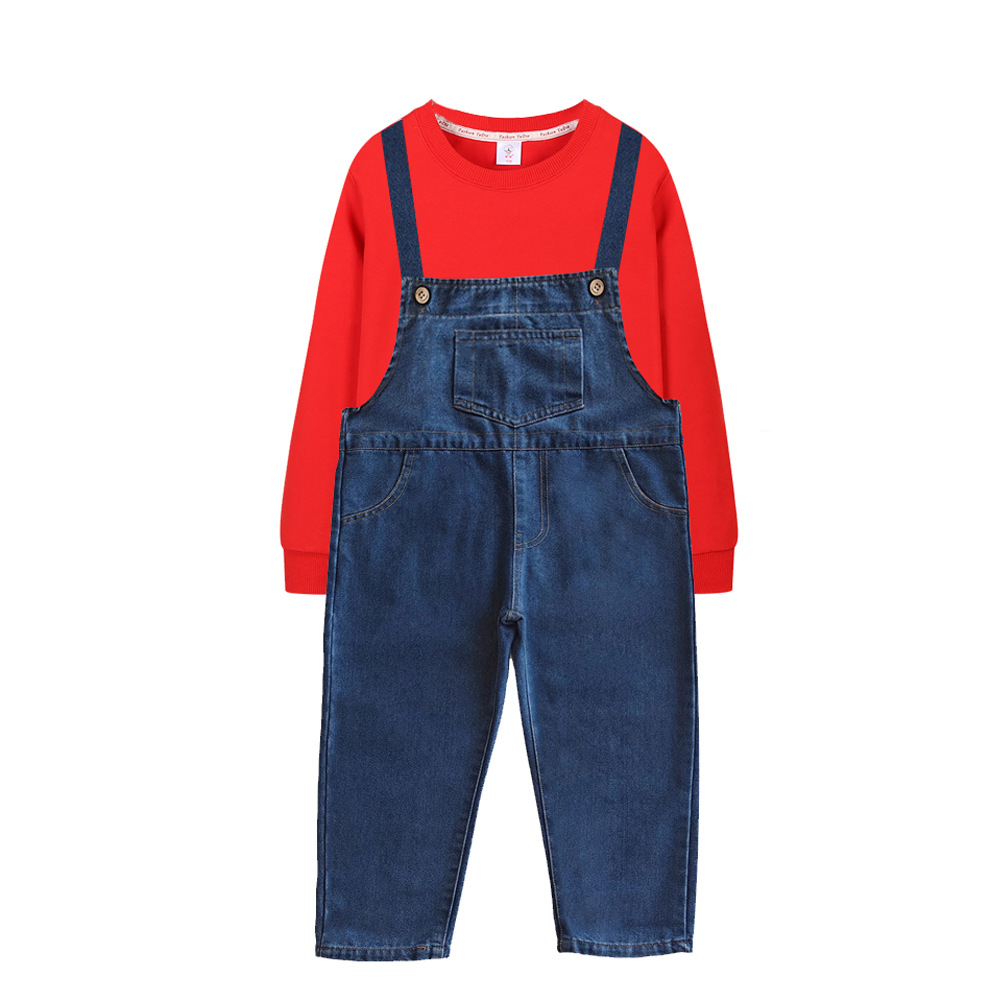 • 파란색 멜빵 바지 + 빨간색 스웨트셔츠
