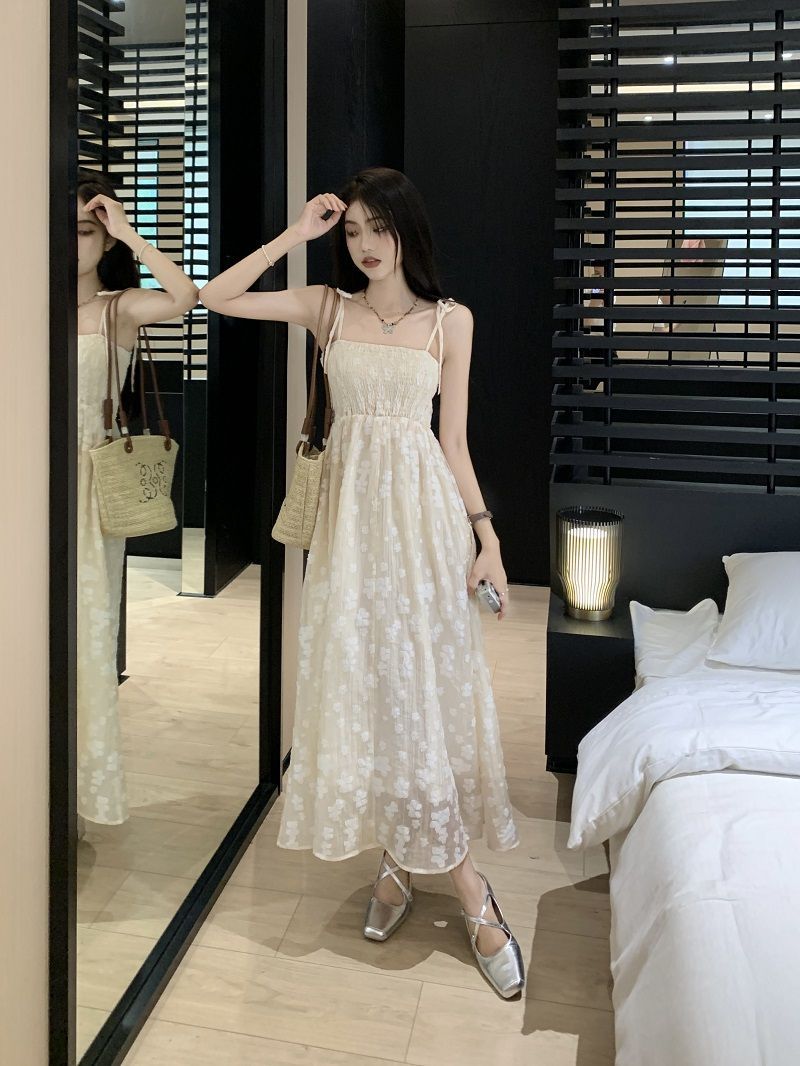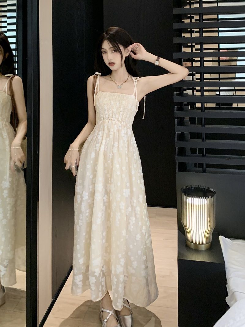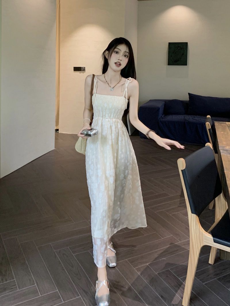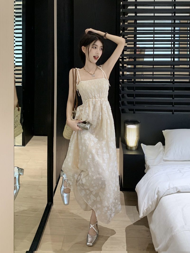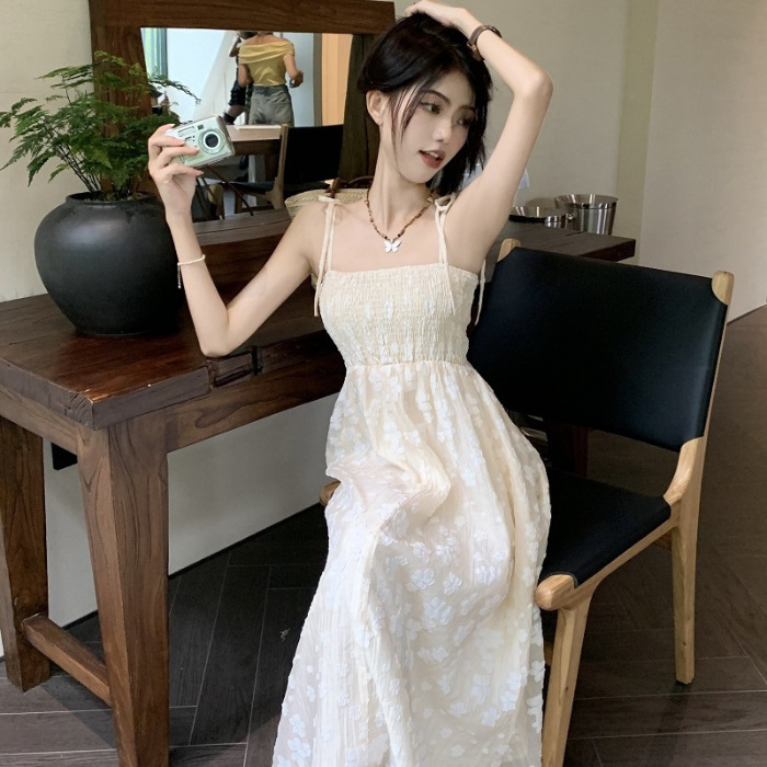 프랑스 달콤한 요정 원피스 수 놓은 Pleated Sling 원피스 2024 여름 새로운 슬림 핏 허리 긴 원피스