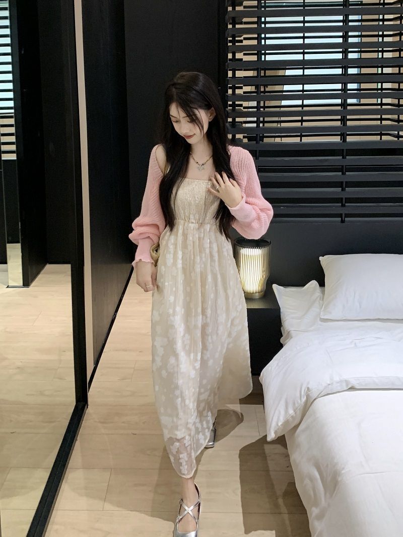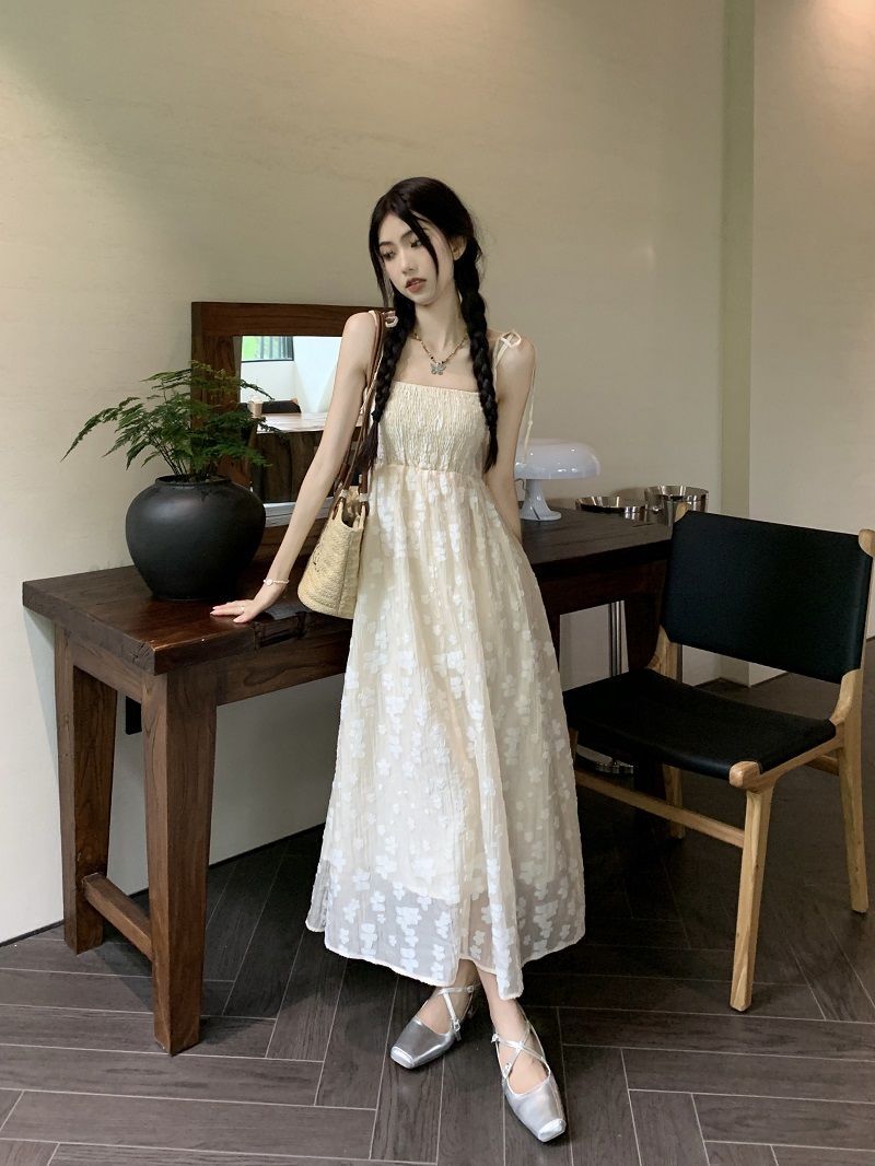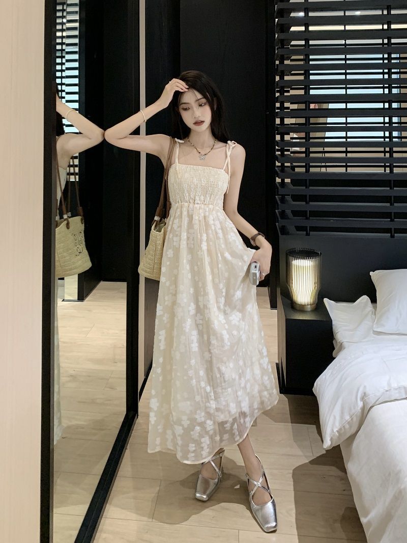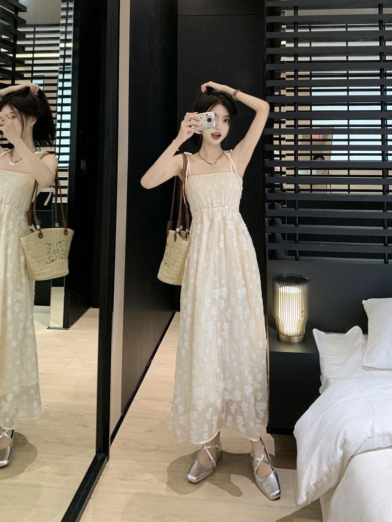 프랑스 달콤한 요정 원피스 수 놓은 Pleated Sling 원피스 2024 여름 새로운 슬림 핏 허리 긴 원피스