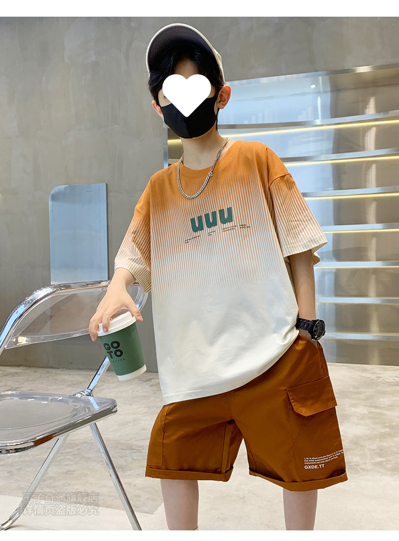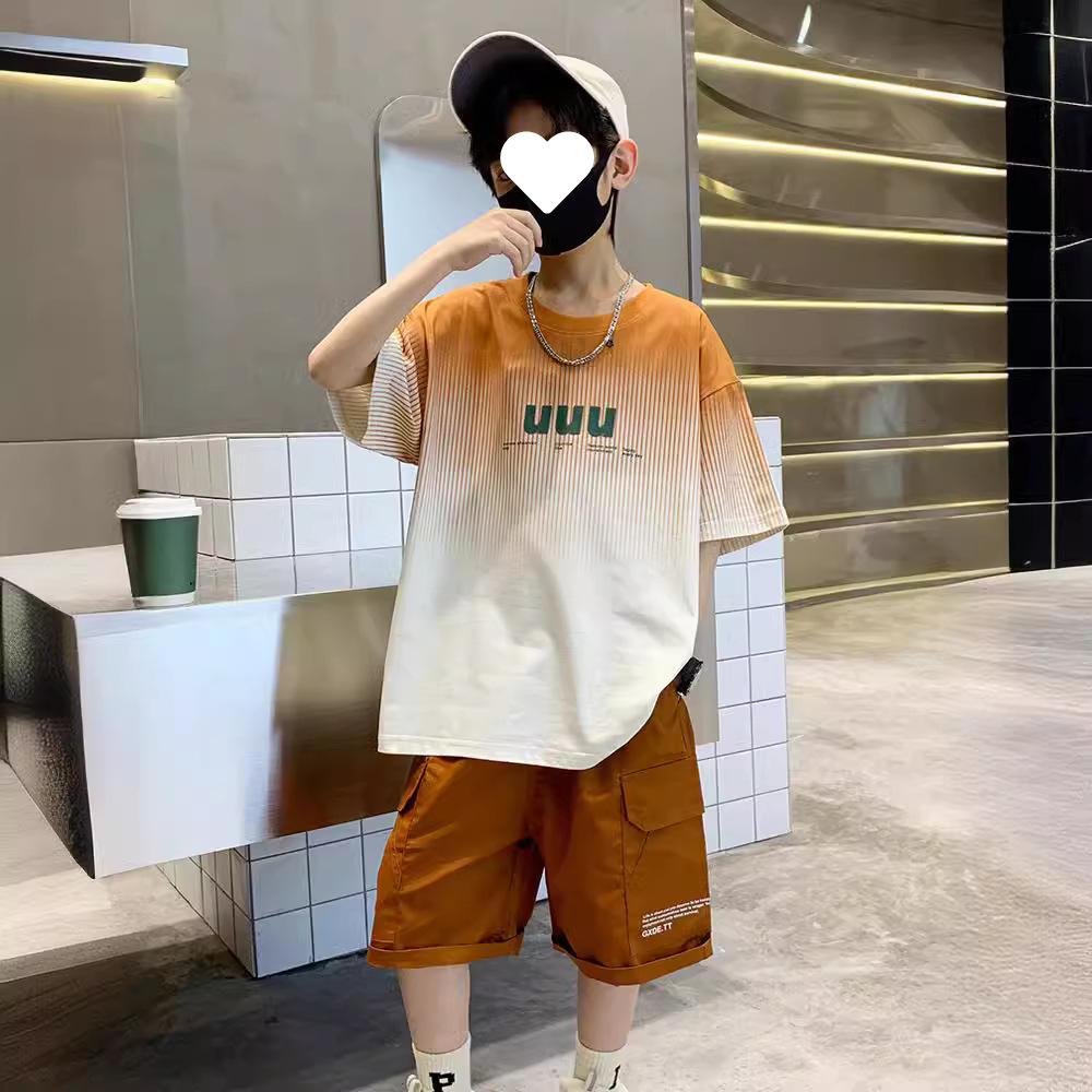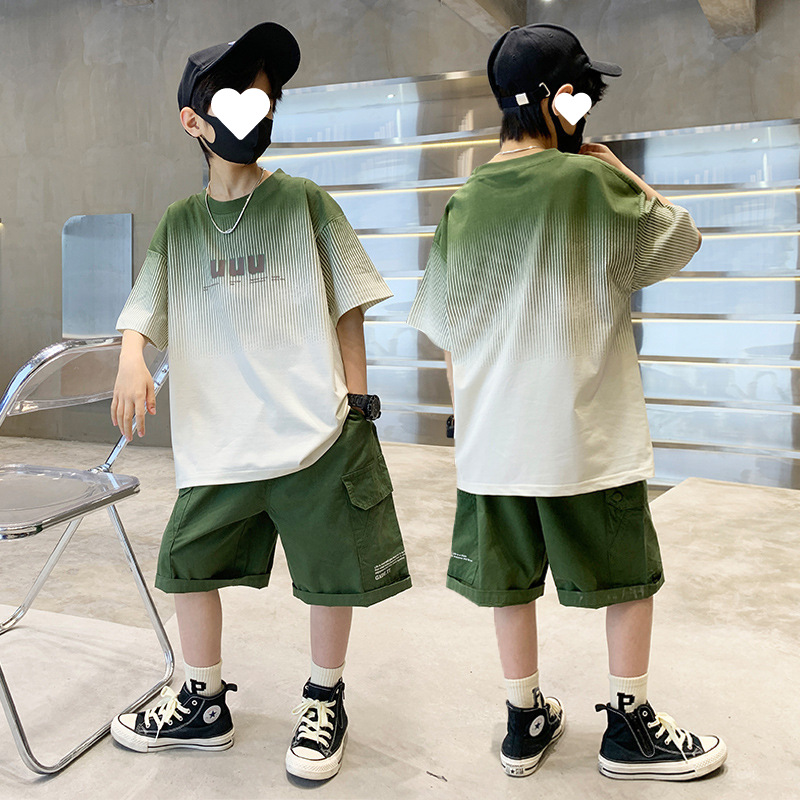 남자들의 여름 세트 캐주얼 세트 2024 새로운 스타일 빅 키즈 그라디언트 티셔츠 작업복 반바지 스포츠 투피스 세트