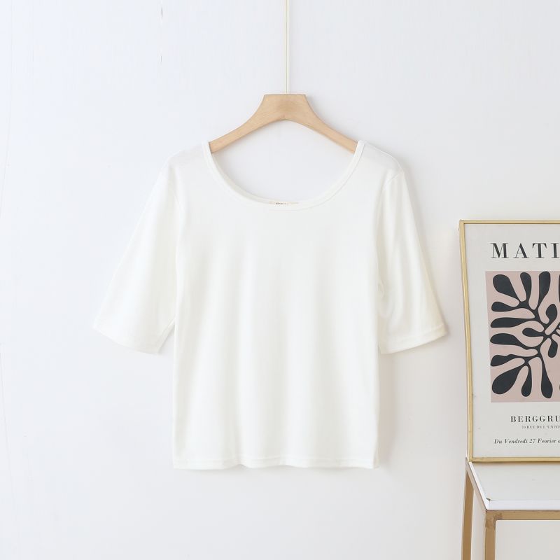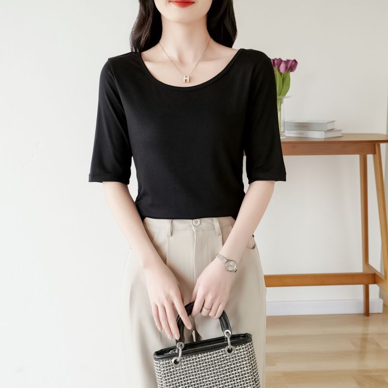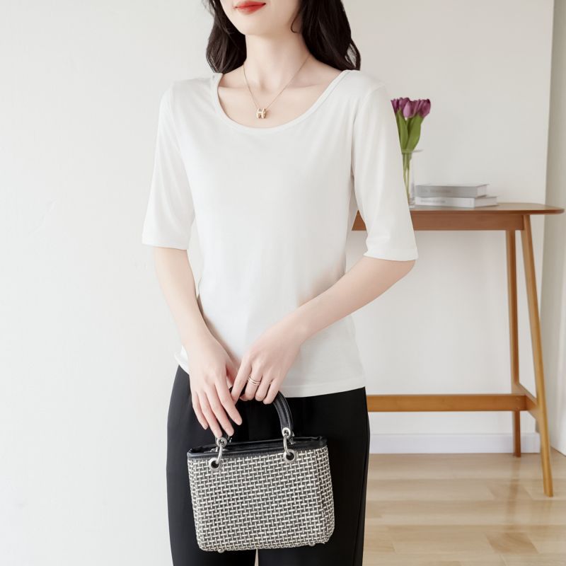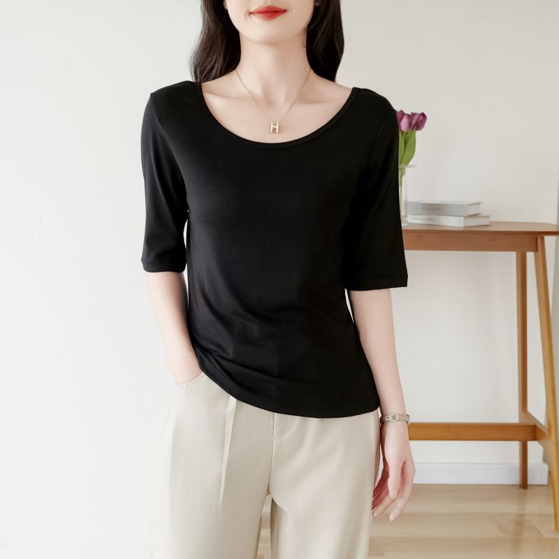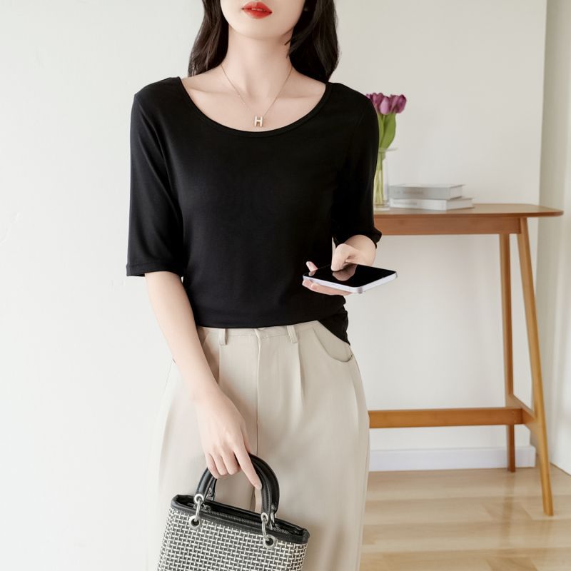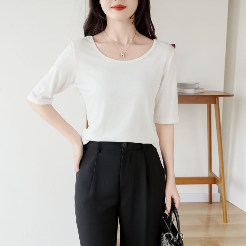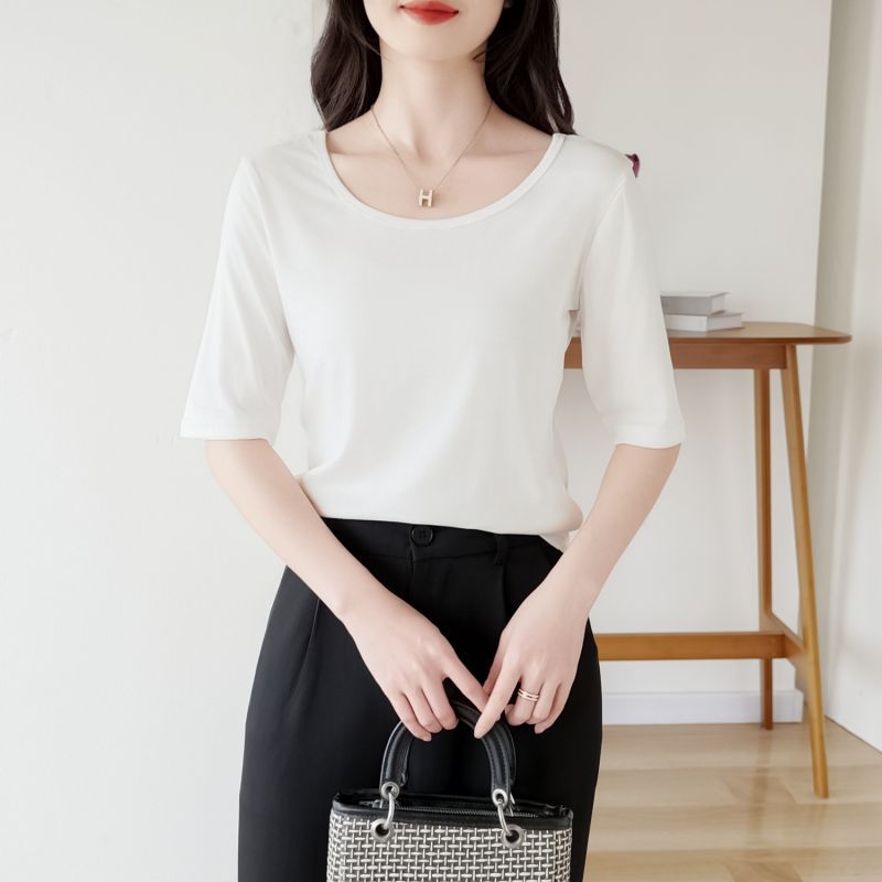 반소매 티셔츠 여자 여름 서양식 올 매치 로우 라운드 섹시 탑 스레드 슬림 핏 슬림 베이스 레이어 셔츠 중소매 티셔츠스토어 가기