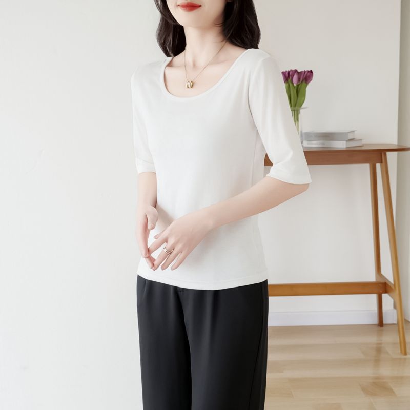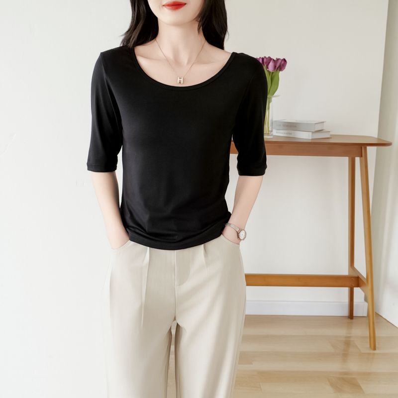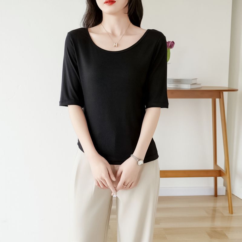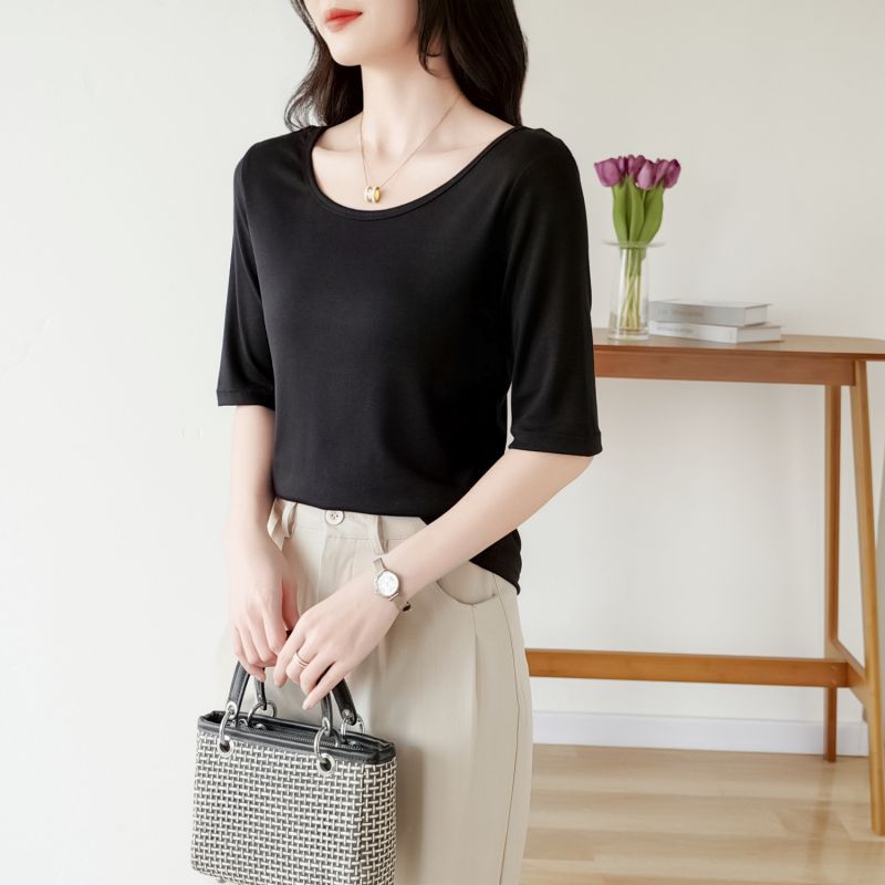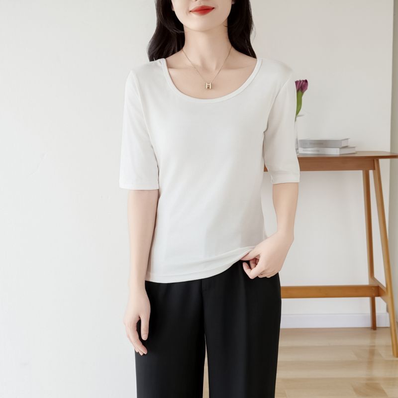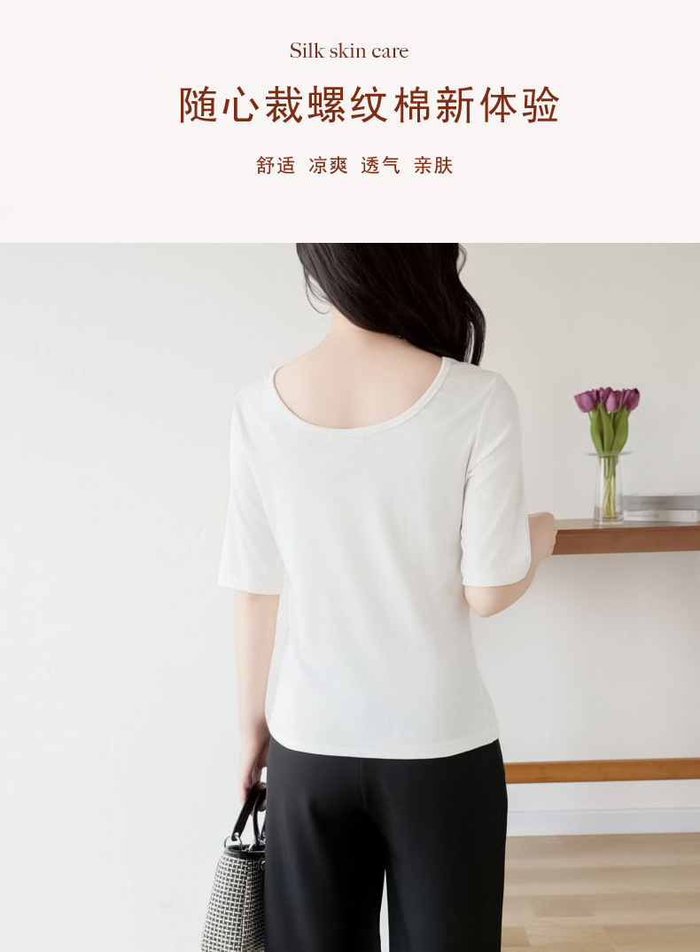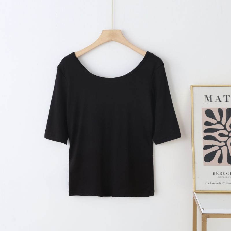 반소매 티셔츠 여자 여름 서양식 올 매치 로우 라운드 섹시 탑 스레드 슬림 핏 슬림 베이스 레이어 셔츠 중소매 티셔츠스토어 가기