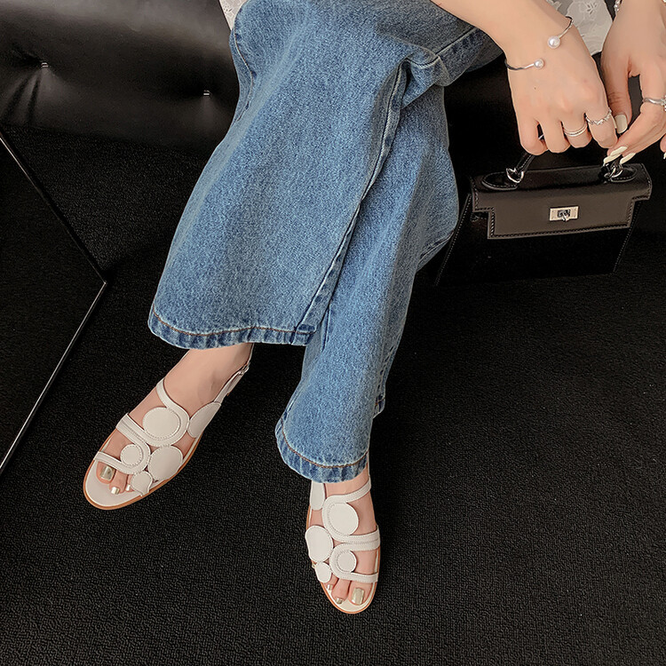 골드 피스 발가락 패션 샌들 여성용 저힐 여름 새 머리 레이어 Cowhide 라운드 발가락 할로우 아웃 여성용 샌들