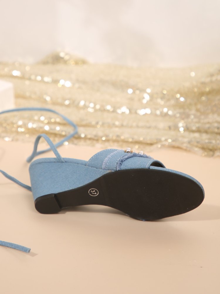 대외 무역 대형 데님 구슬 쿨 부츠 2024 여름 새로운 웨지 힐 스트랩 머핀 로마 신발 유럽과 미국 스타일스토어 가기