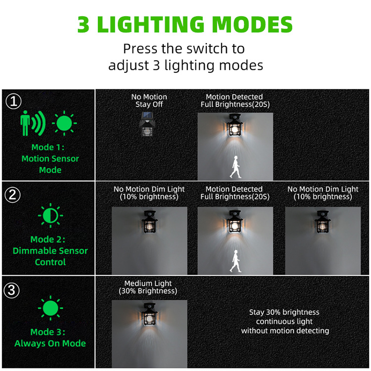 1:人体感应模式(夜间人来高亮,人离开后约20S灯灭)