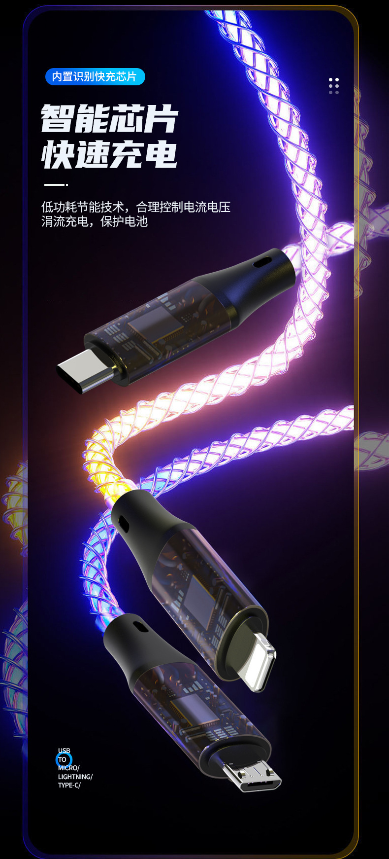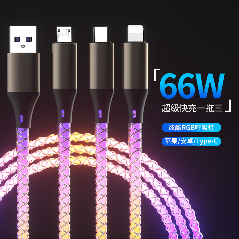 고속 충전 RGB 데이터 케이블 1대3 다채로운 발광 애플 샤오미 OPPO 화웨이 호환 다채로운 케이블