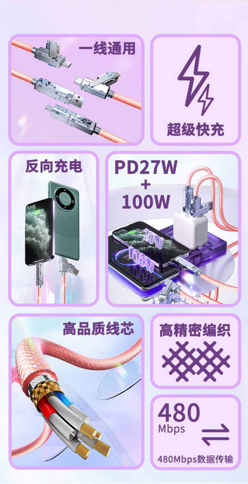꼰 2-2 데이터 케이블은 애플 15 아연 합금 4-in -1 스위칭 100W 초고속 충전 PD27W 에 적합합니다.스토어 가기