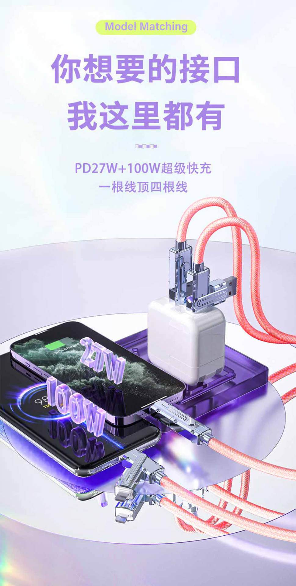 꼰 2-2 데이터 케이블은 애플 15 아연 합금 4-in -1 스위칭 100W 초고속 충전 PD27W 에 적합합니다.