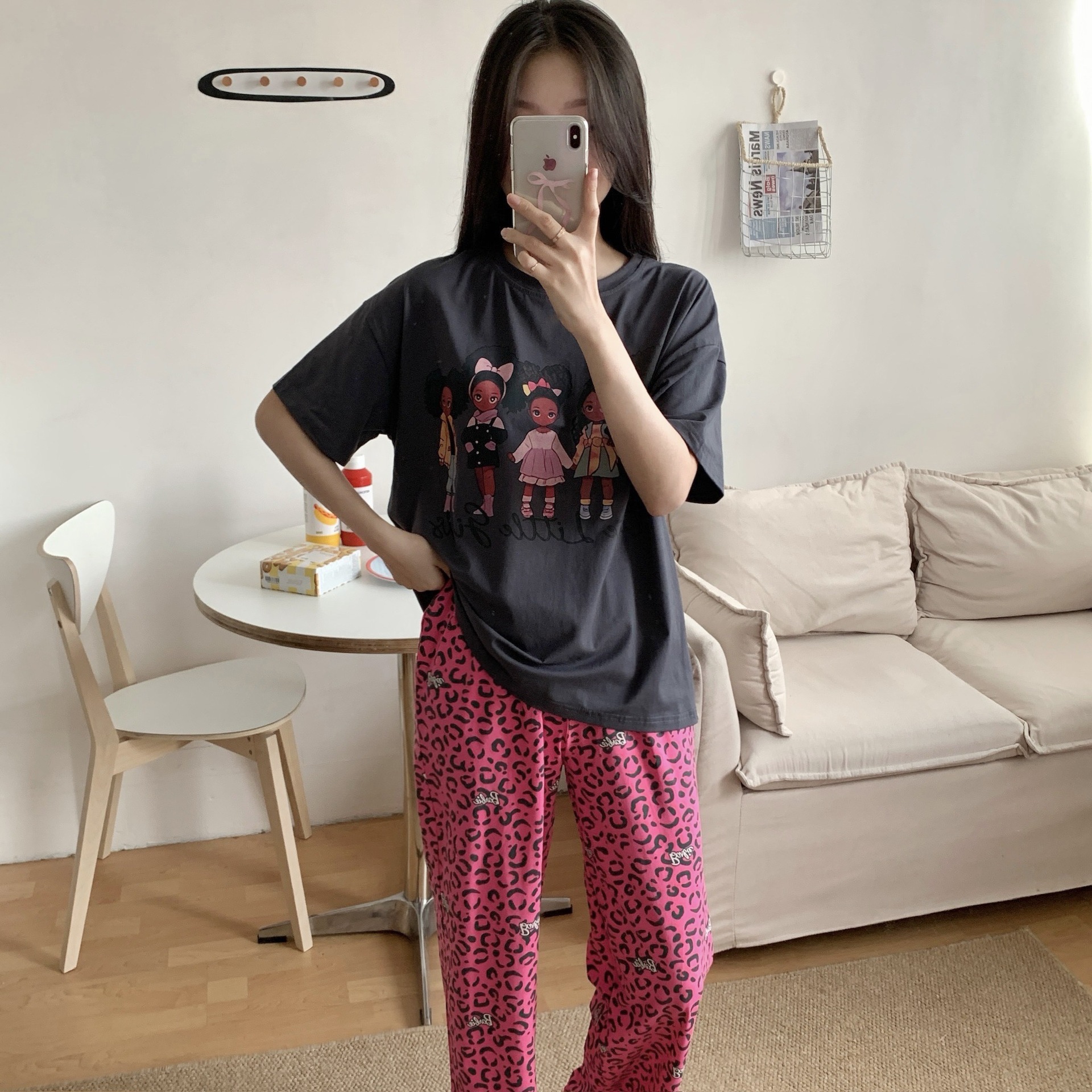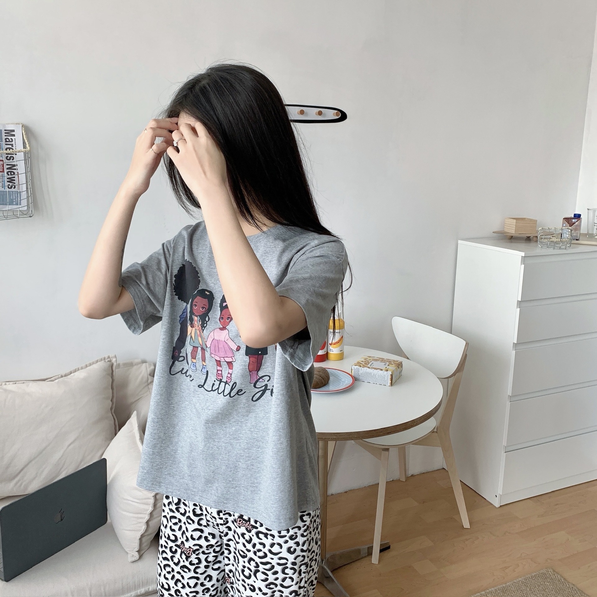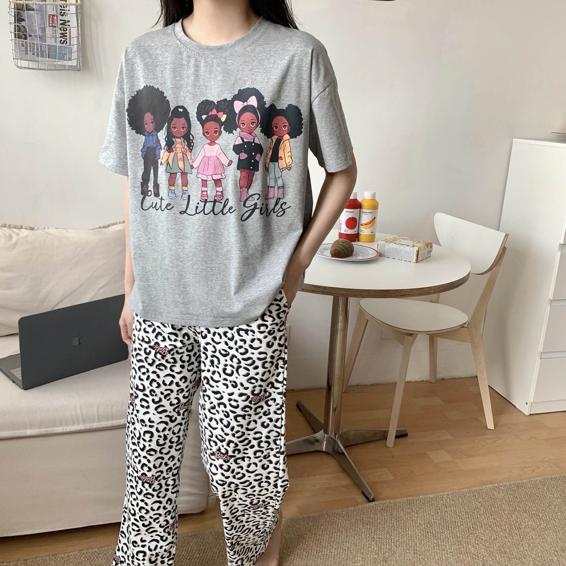 아프리카 소녀 인쇄 둥근 목 순면 짧은 소매 바지 홈 세트 여름 통기성 편안한 외주스토어 가기