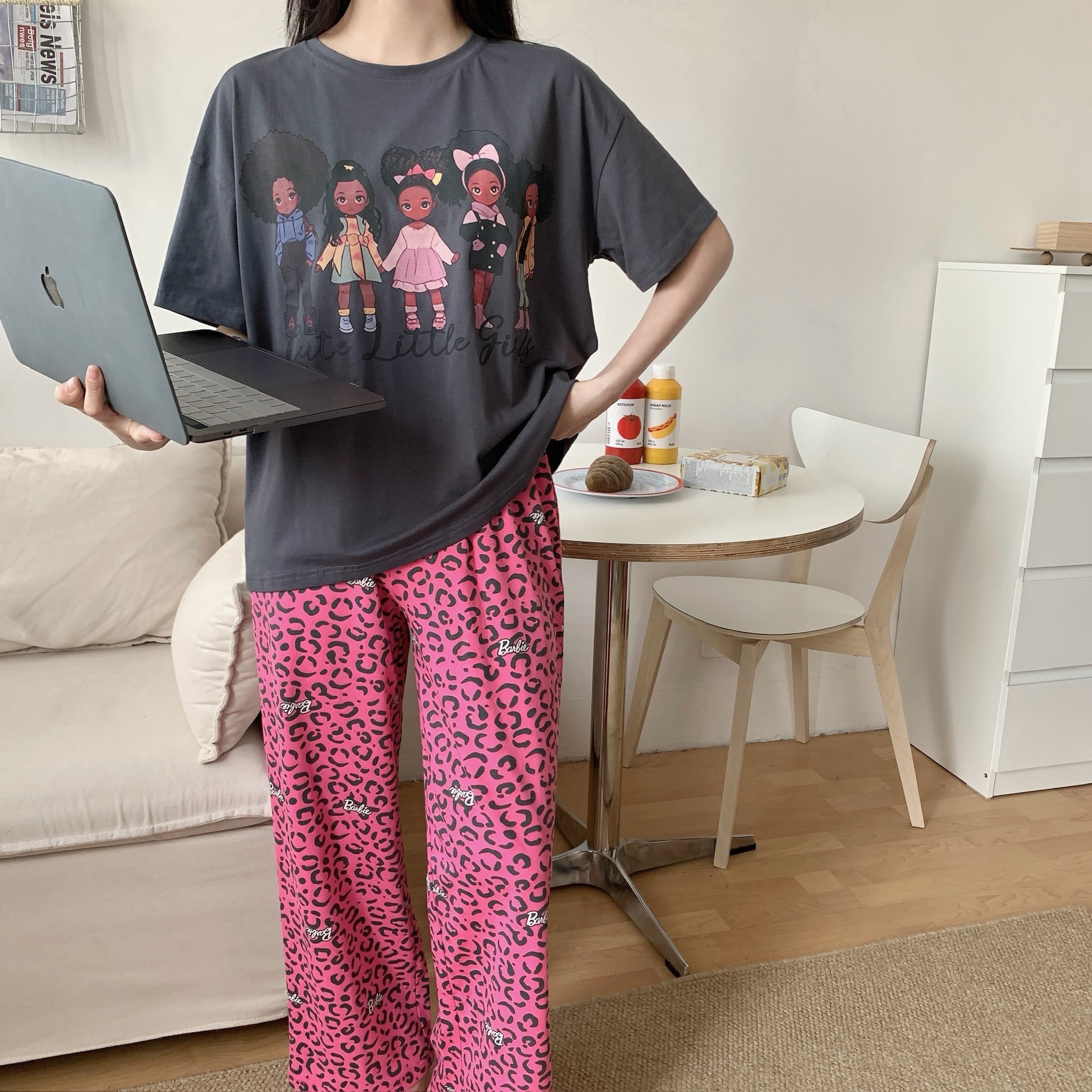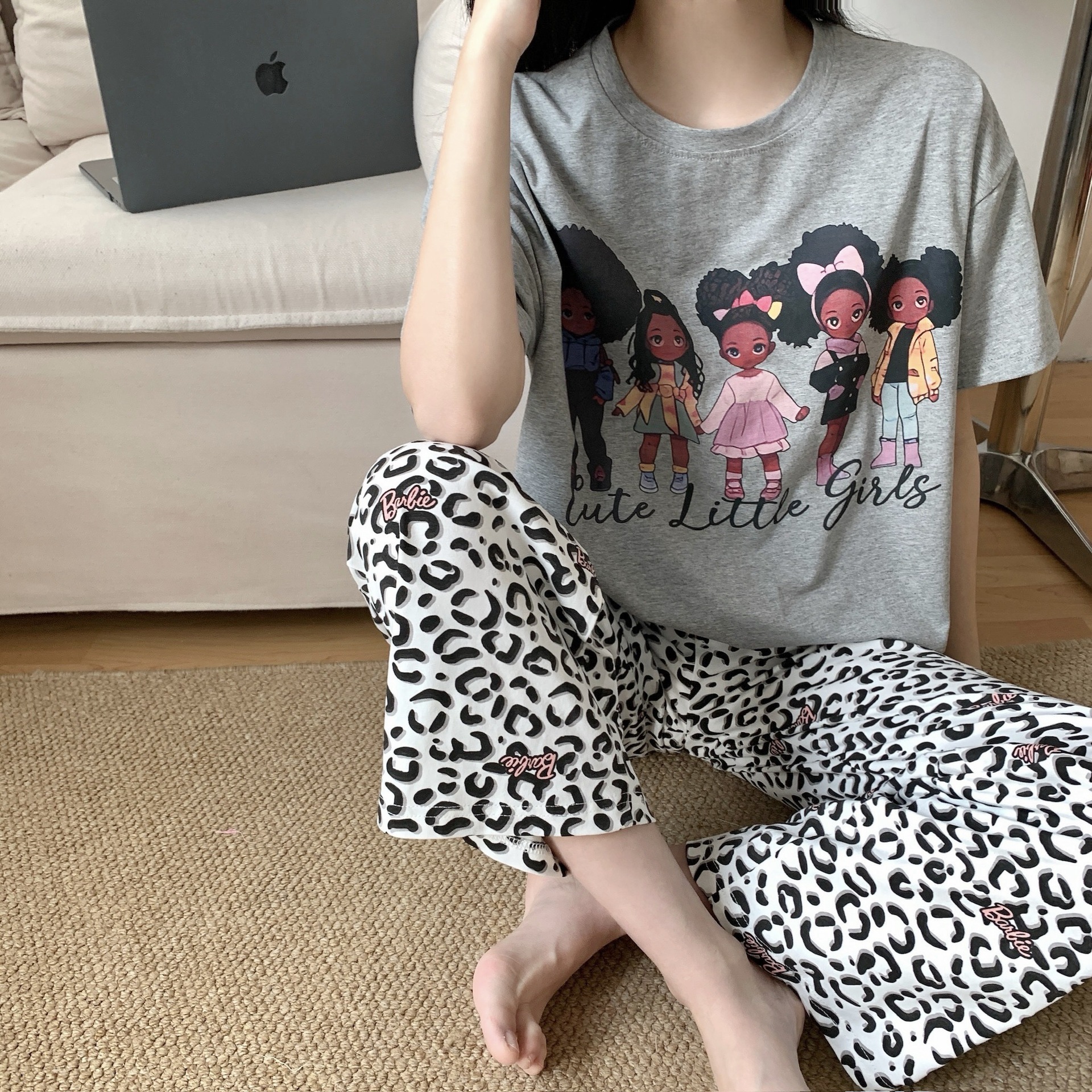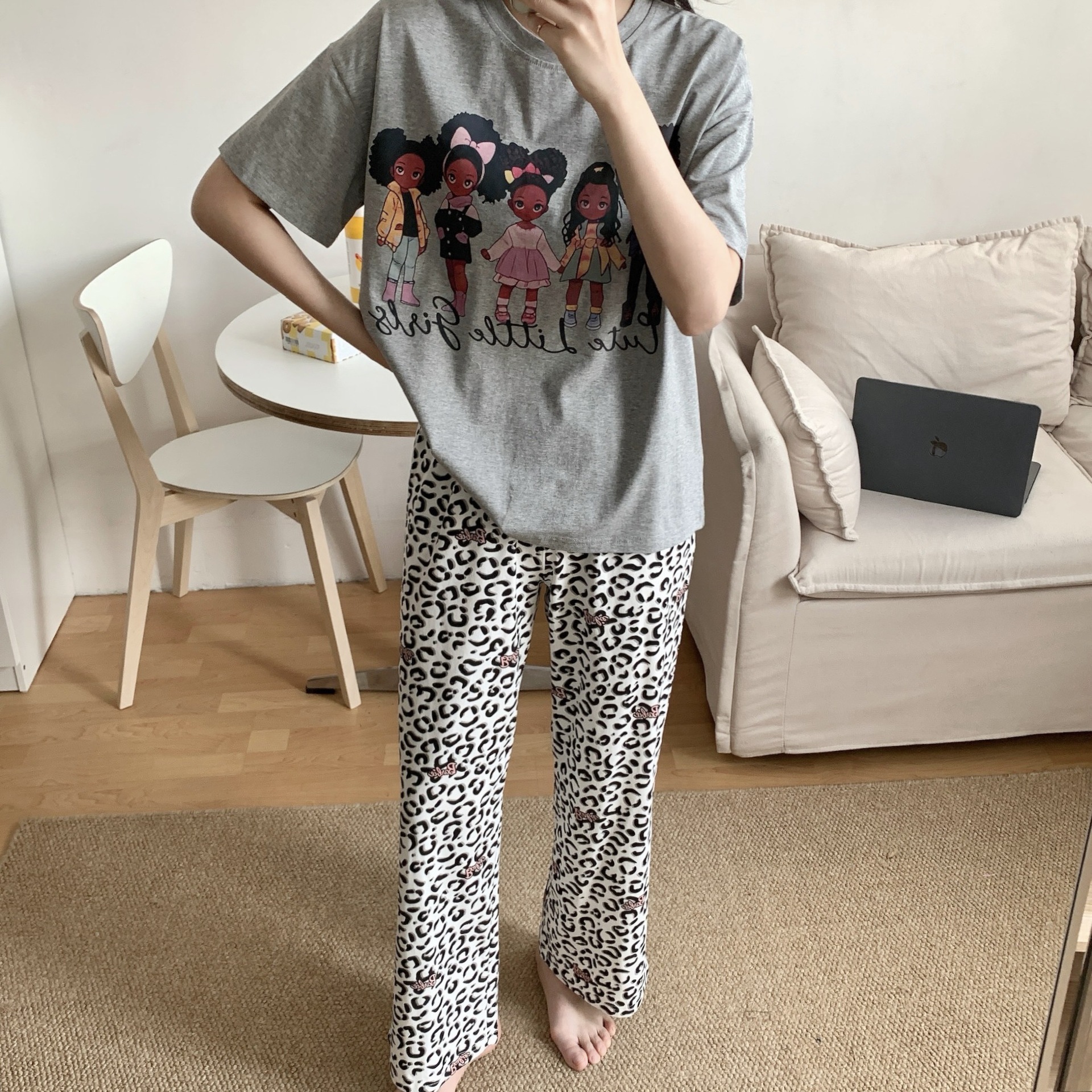 아프리카 소녀 인쇄 둥근 목 순면 짧은 소매 바지 홈 세트 여름 통기성 편안한 외주스토어 가기