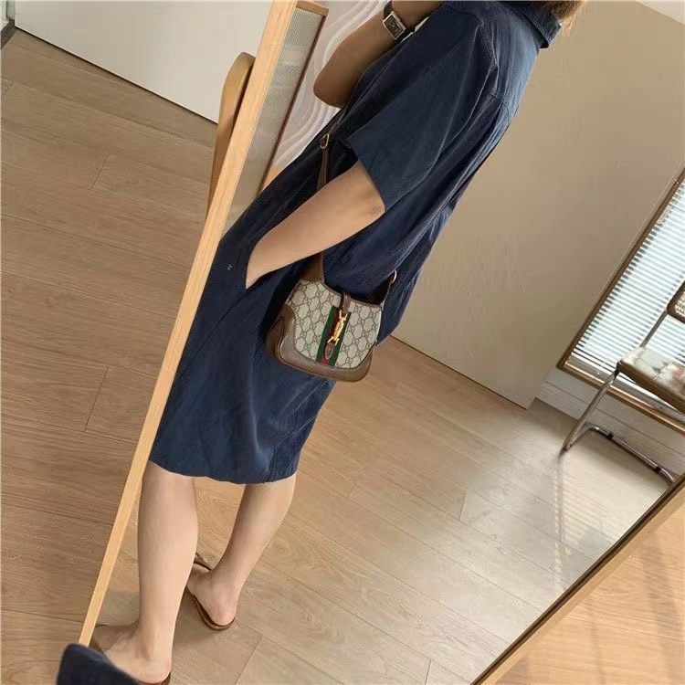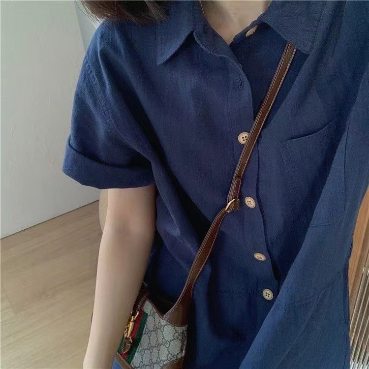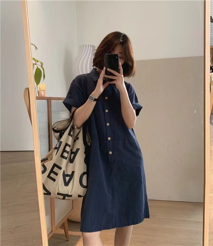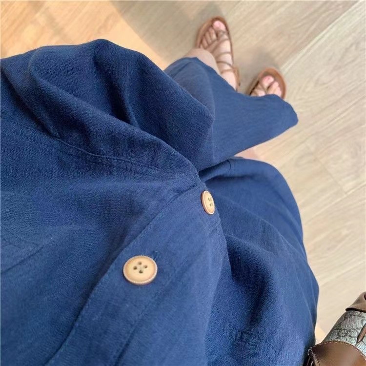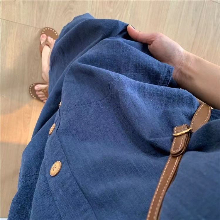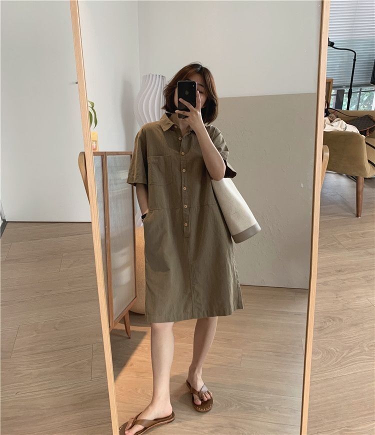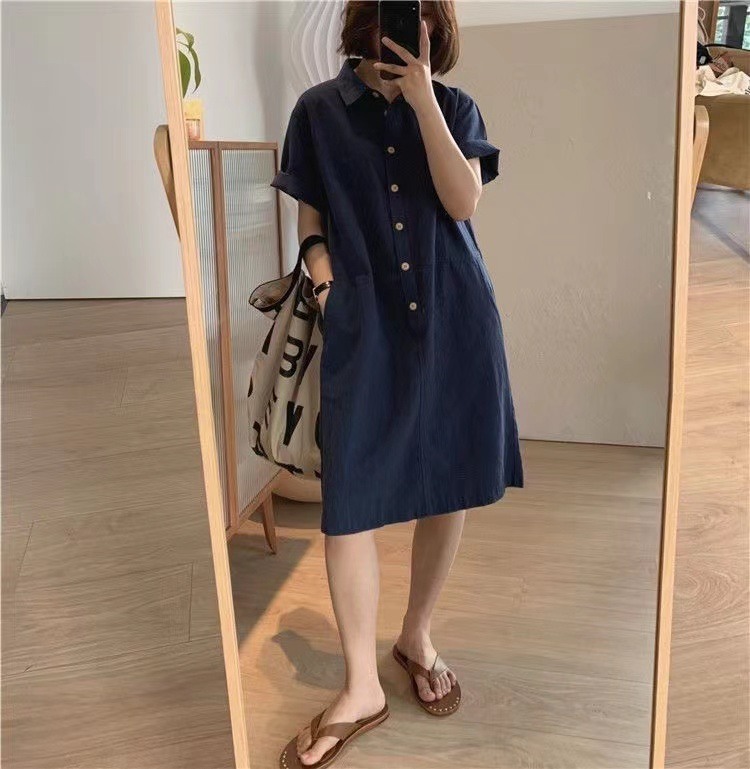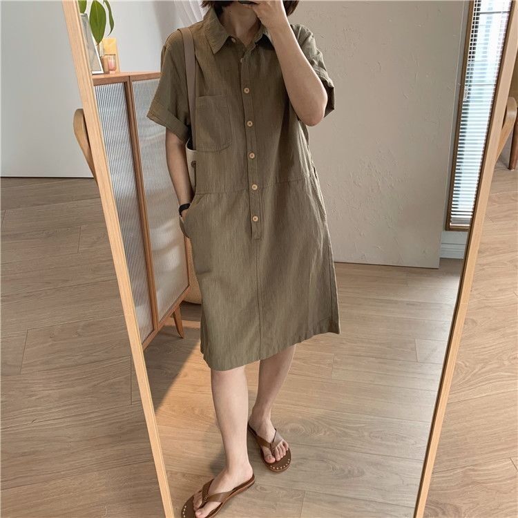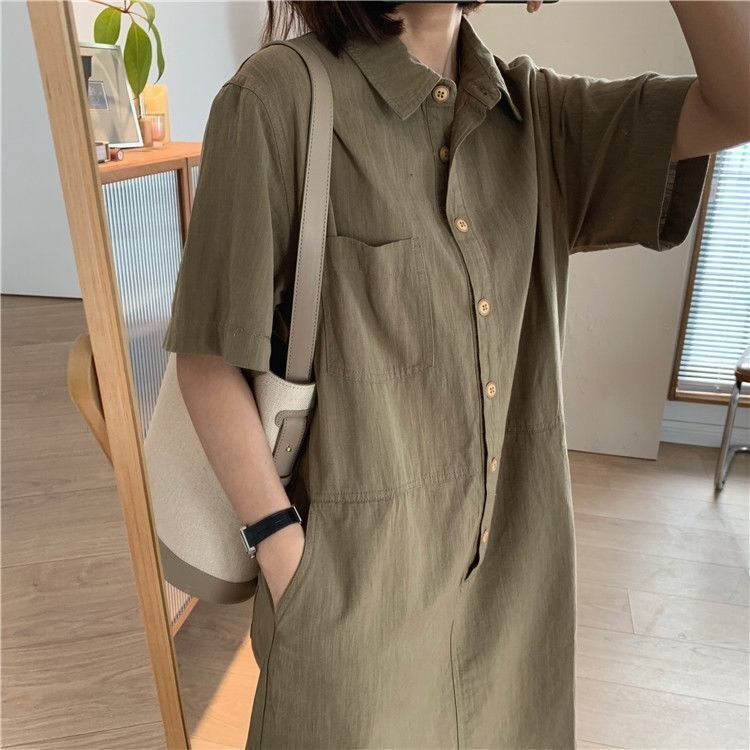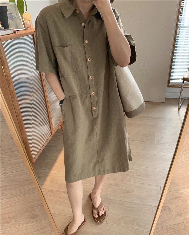면 및 리넨 반팔 셔츠 여성용 셔츠 중간 길이 2024 여름 새로운 간단한 복고풍 목 스트레이트 원피스스토어 가기