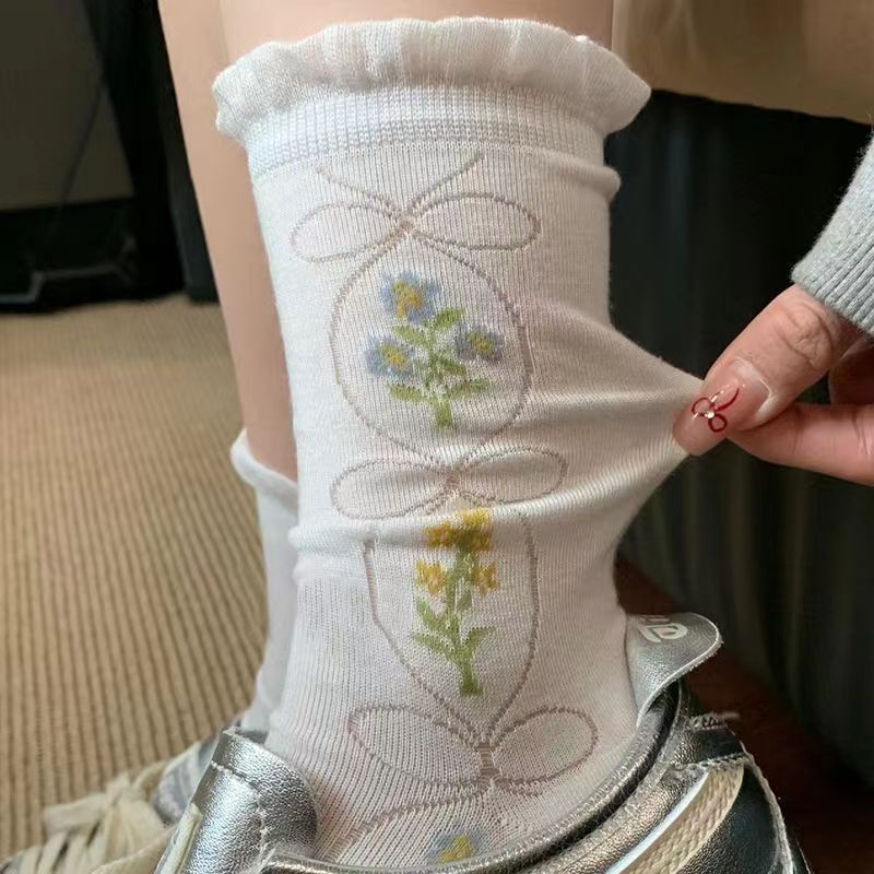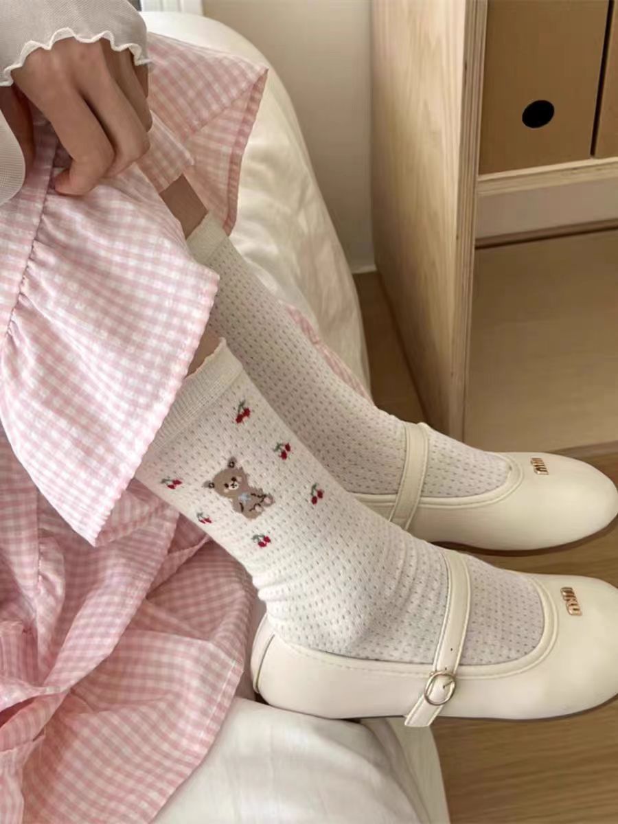 메쉬 양말 여성용 미드 튜브 양말 순수 코튼 여름 얇은 체리 베어 레이스 작은 가죽 신발 포장 미끄럼 방지 양말스토어 가기
