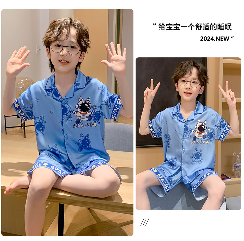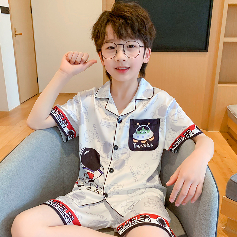 어린 소년을위한 여름 소년 잠옷 아이스 실크 반팔 세트 홈 옷 여름 얇은 에어컨 옷스토어 가기