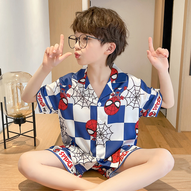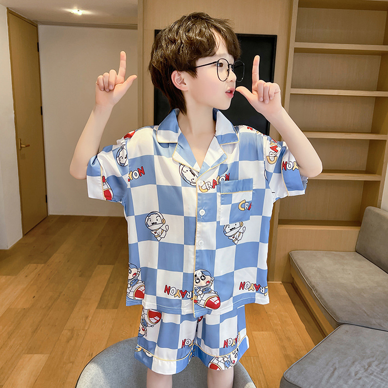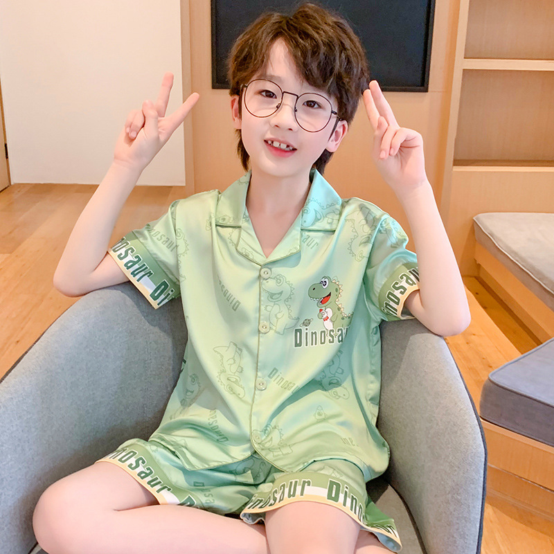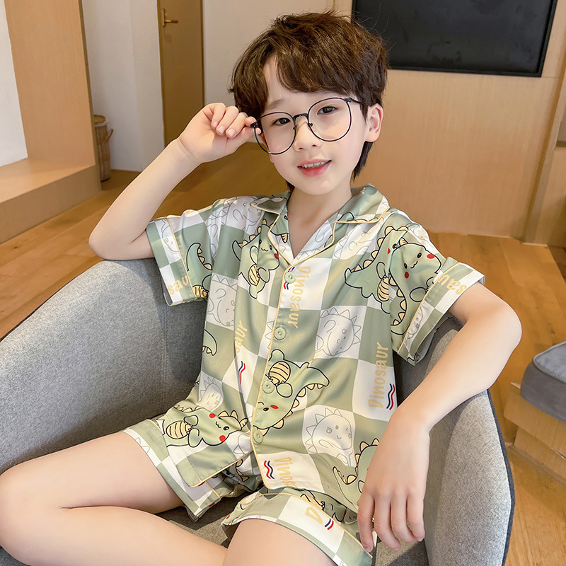 어린 소년을위한 여름 소년 잠옷 아이스 실크 반팔 세트 홈 옷 여름 얇은 에어컨 옷