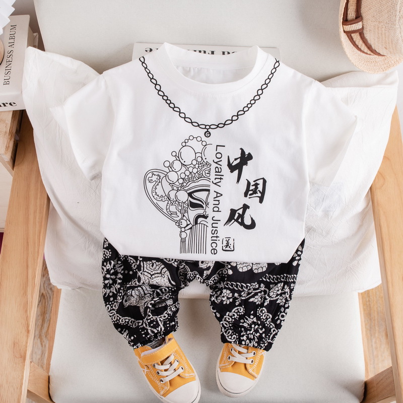 소년 중국 스타일 거리 세트 여름 새로운 유행 캐주얼 아기 베이징 오페라 하프 메이크업 짧은 소매 짧은 바지 커버스토어 가기